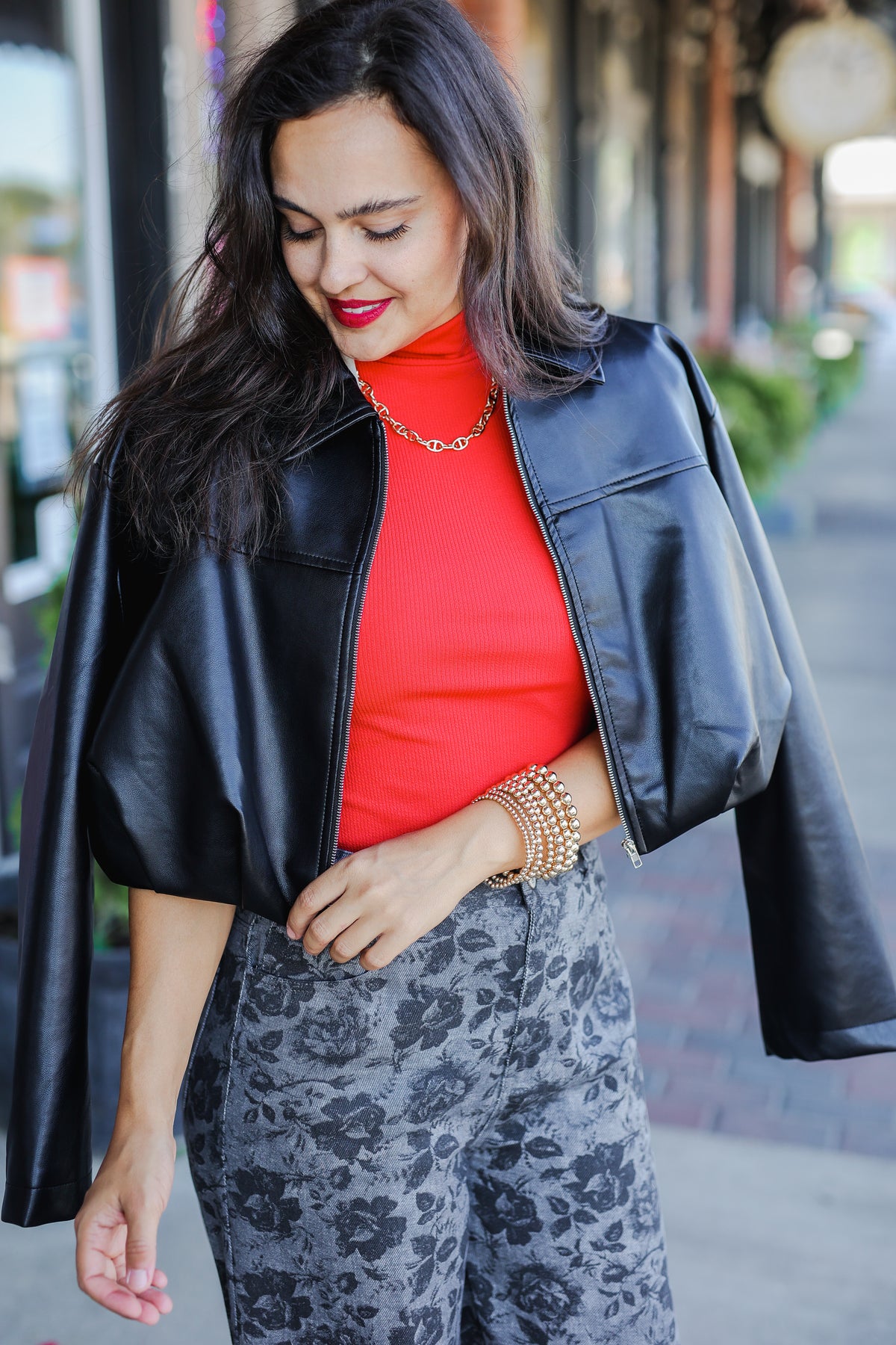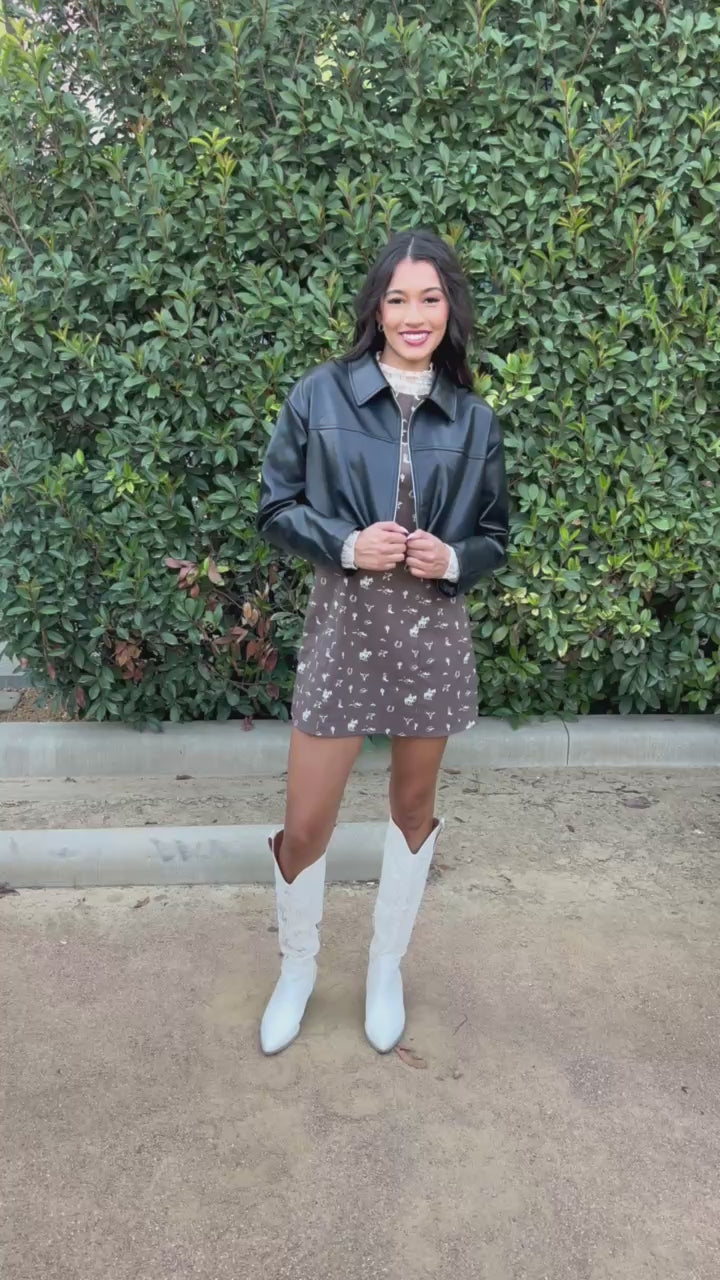 Turn heads in The Lennox Cropped Jacket, a modern twist on the classic women’s leather jacket. Designed in sleek black with a relaxed, streetwear-inspired fit, it features a zip-front closure, collared neckline, and long dropped-shoulder sleeves for an effortlessly cool silhouette. The cropped cut adds just the right edge, making it the perfect layer over dresses, denim, or trousers. Crafted from a smooth leather-like finish, this boutique outerwear essential brings versatile styling power—whether you’re headed to a night out, coffee date, or weekend adventure, Lennox delivers polished ease with downtown attitude.