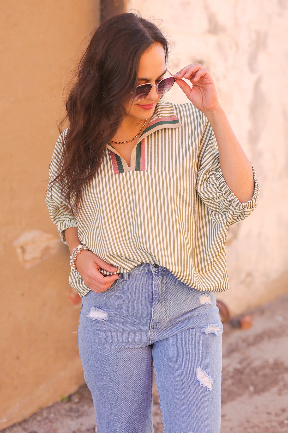 Effortlessly blending comfort with style, the Always On The Run Top in Olive is a versatile women’s blouse designed to transition from business casual to laid-back sophistication. Featuring batwing half-length sleeves with elastic cuffs, a striped pattern, and a high collar v-neckline accented with teal detailing, this chic piece delivers both polish and ease. Pair with trousers for the office or denim for weekend outings.