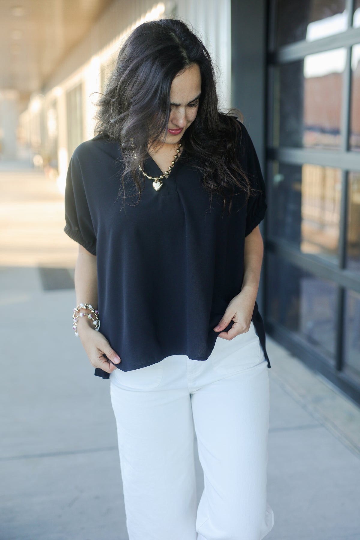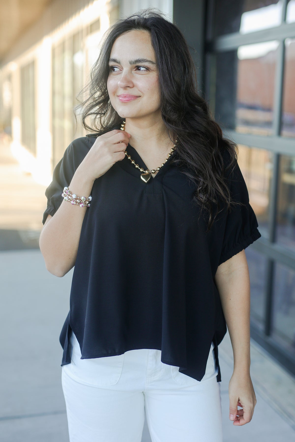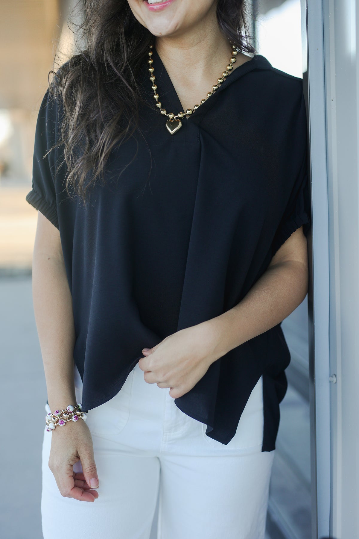 Meet the top that makes “effortlessly polished” your everyday vibe. The Elevated Chic Collared Blouse – Black features a relaxed silhouette with a sleek collared V-neckline and short sleeves finished with gathered detailing for just the right amount of style. The classic black shade makes it one of those wear-anywhere staples — perfect for the office with tailored trousers, styled casually with denim, or dressed up with a skirt and heels for a night out. Lightweight and versatile, this black collared blouse is a closet essential you’ll be glad to have on repeat.
