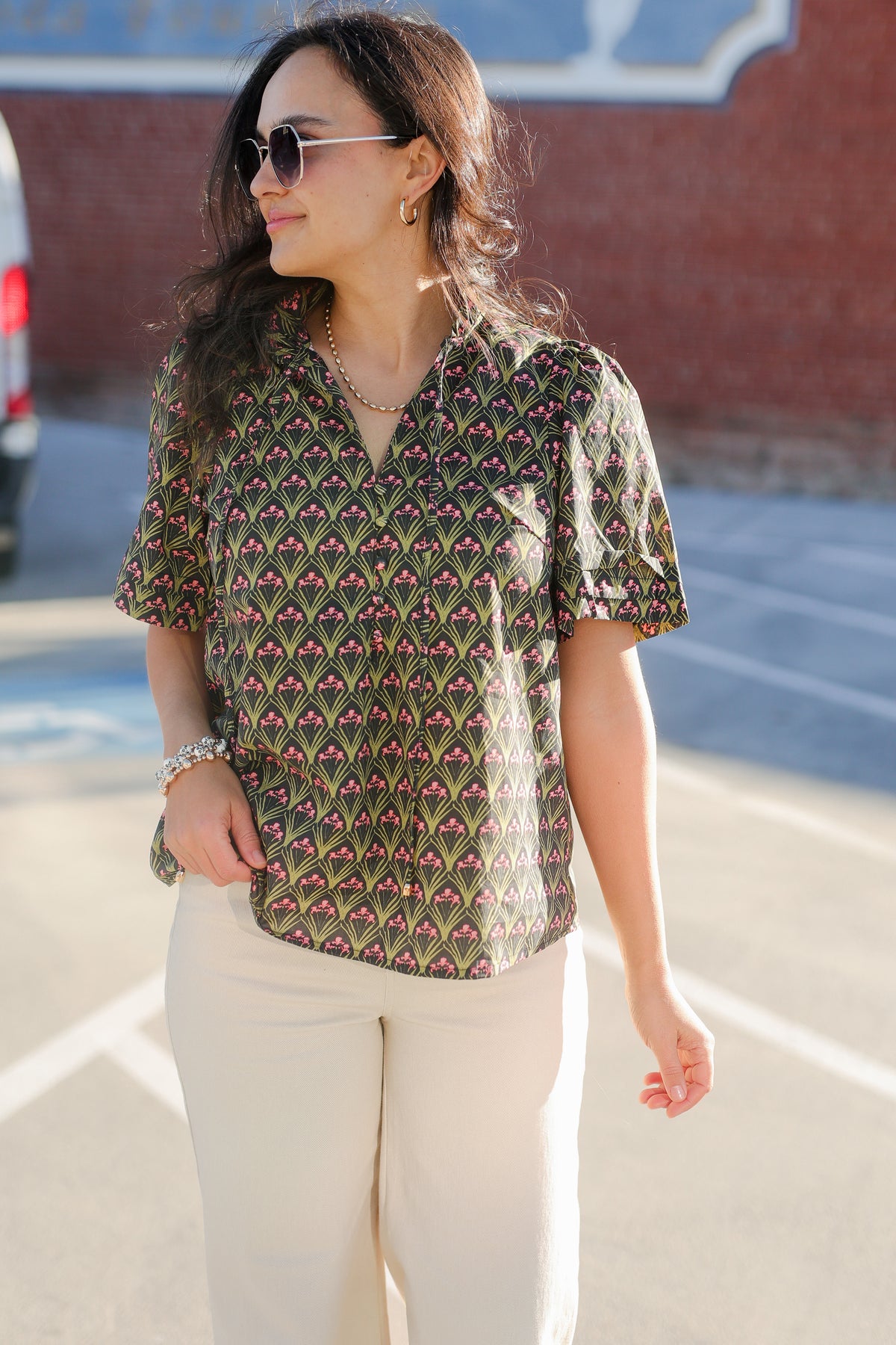 The Sunset Petals Cotton Blouse brings bold color and effortless charm to your wardrobe with its eye-catching print. Made from 100% cotton, this women’s short sleeve blouse is breathable, lightweight, and easy to style for any season. The collared neckline and button-front detail lend a touch of polish, while the vibrant pattern adds playful personality to your everyday look.