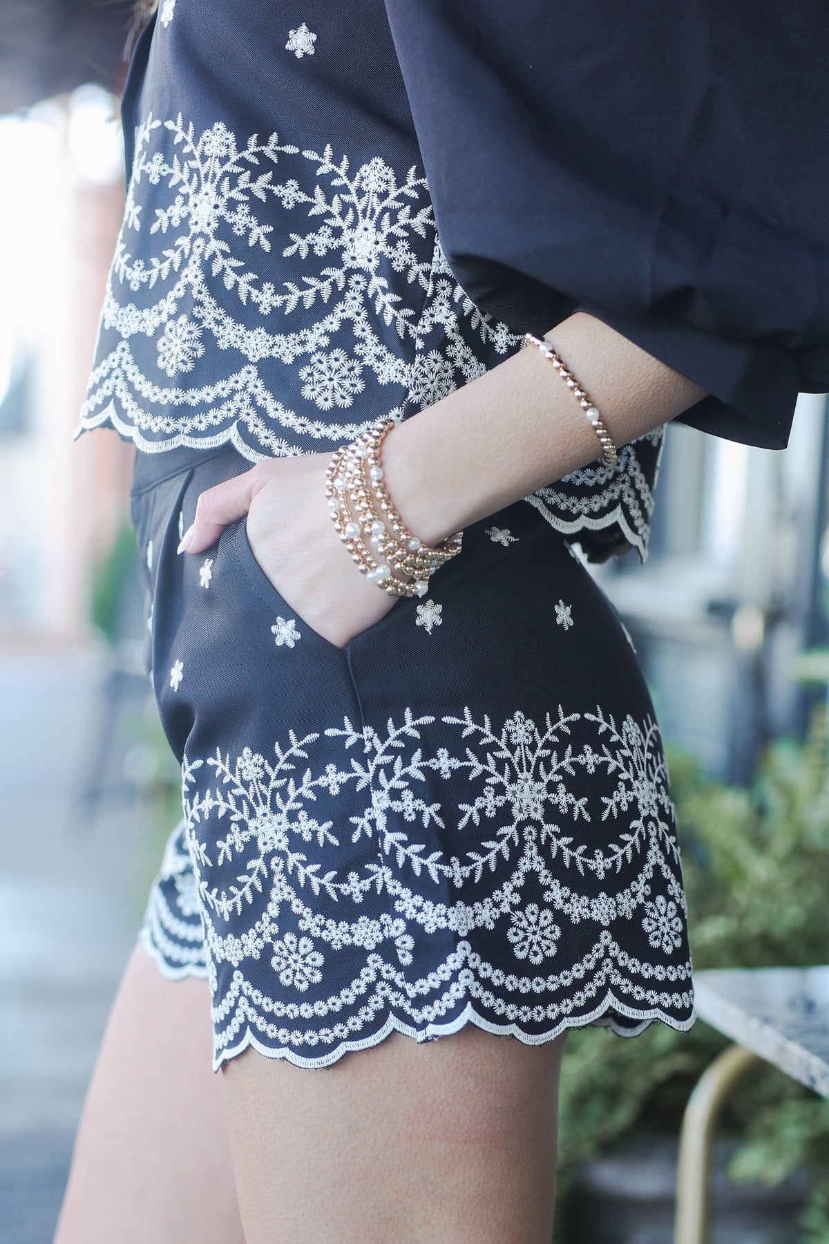 You will be looking effortlessly elegant in these embroidered shorts! Featuring a black fabric with white embroidered detailing, scalloped lace-inspired hem, flattering tailored fit, and a comfortable pull-on style, these shorts are perfect for creating effortless looks from day to night. The 100% cotton fabric provides lightweight, breathable comfort.
