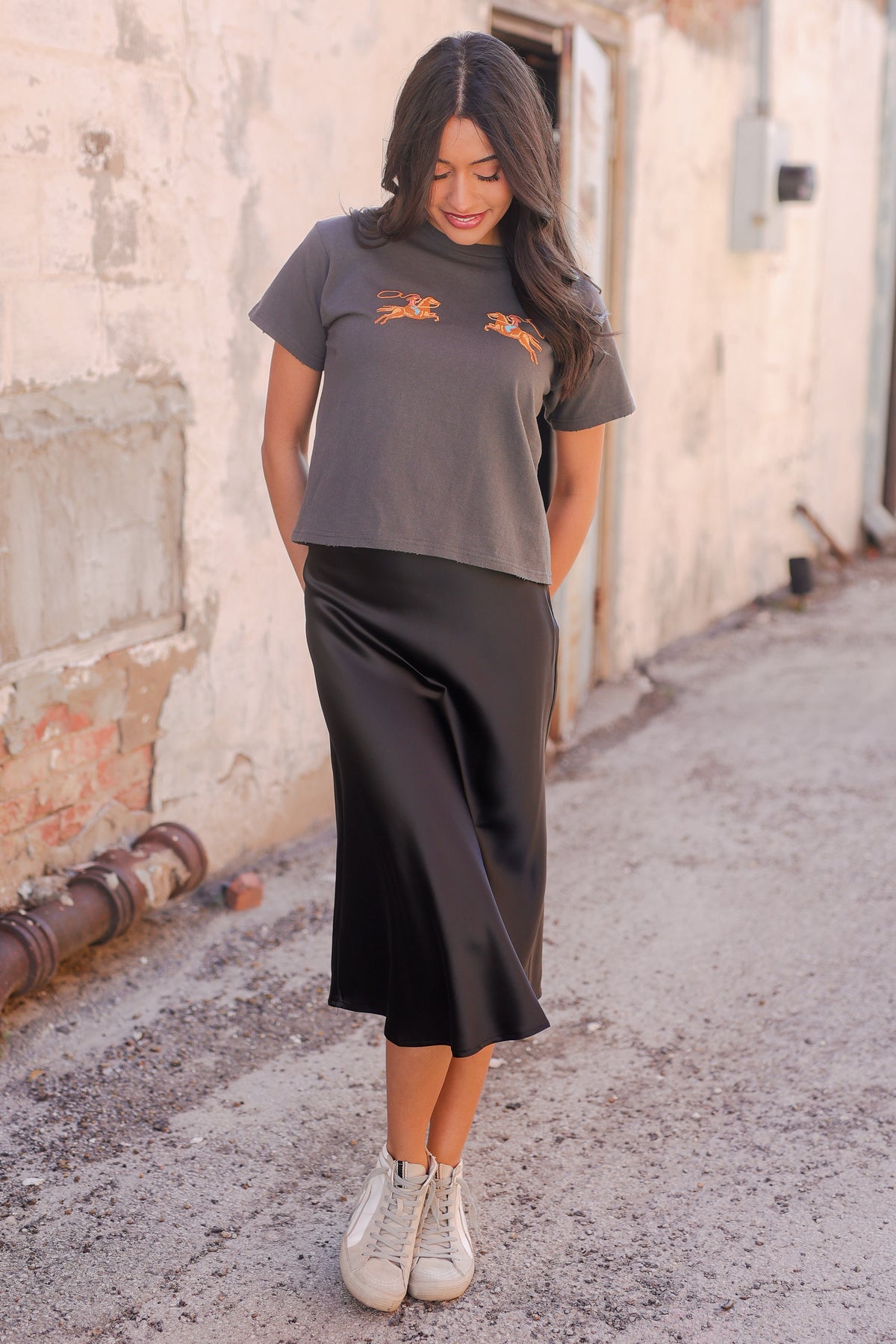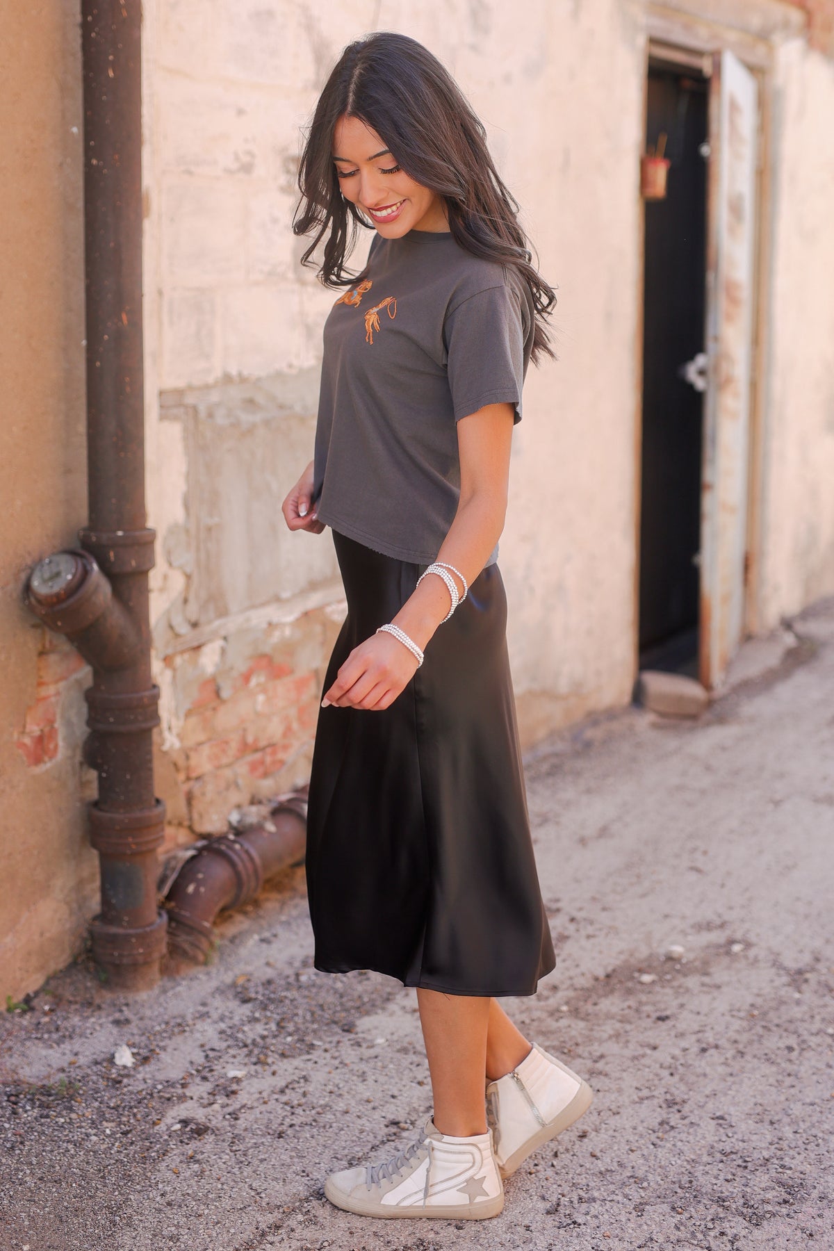 You will be feeling elegant and chic in this luxe satin skirt! Featuring a high-waisted fit, flowy graceful silhouette, silky-smooth satin finish in black, and stretch fabric, this skirt is perfect for creating effortless looks from day to night. The polyester-spandex blend provides both structure and comfort for all-day wear.
