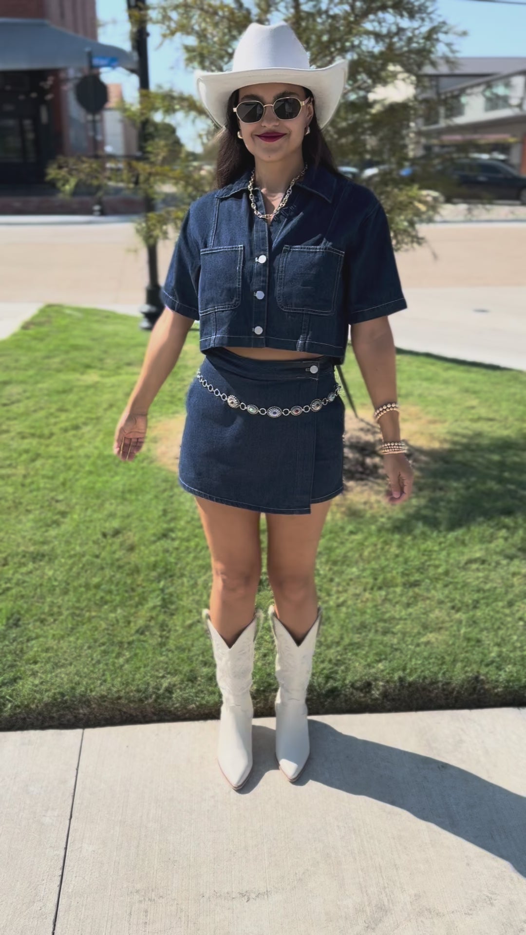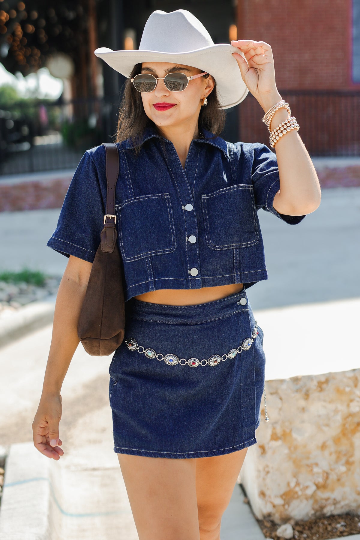 The Midnight Rider Chambray Skort – Dark Wash gives you the perfect mix of style and function. Designed with a wrap-front skirt overlay and hidden shorts, it delivers the look of a mini with the ease and coverage of shorts—so you can move confidently wherever the day takes you.