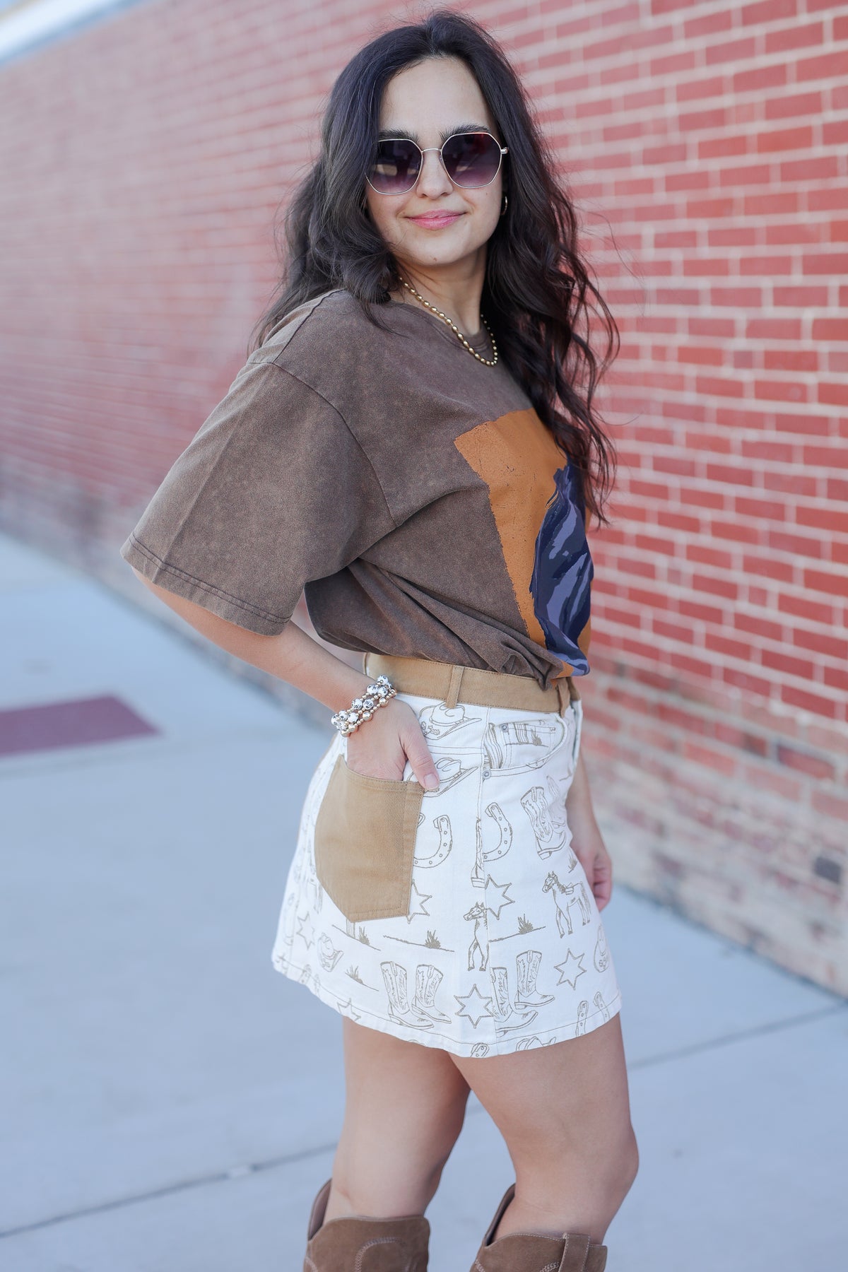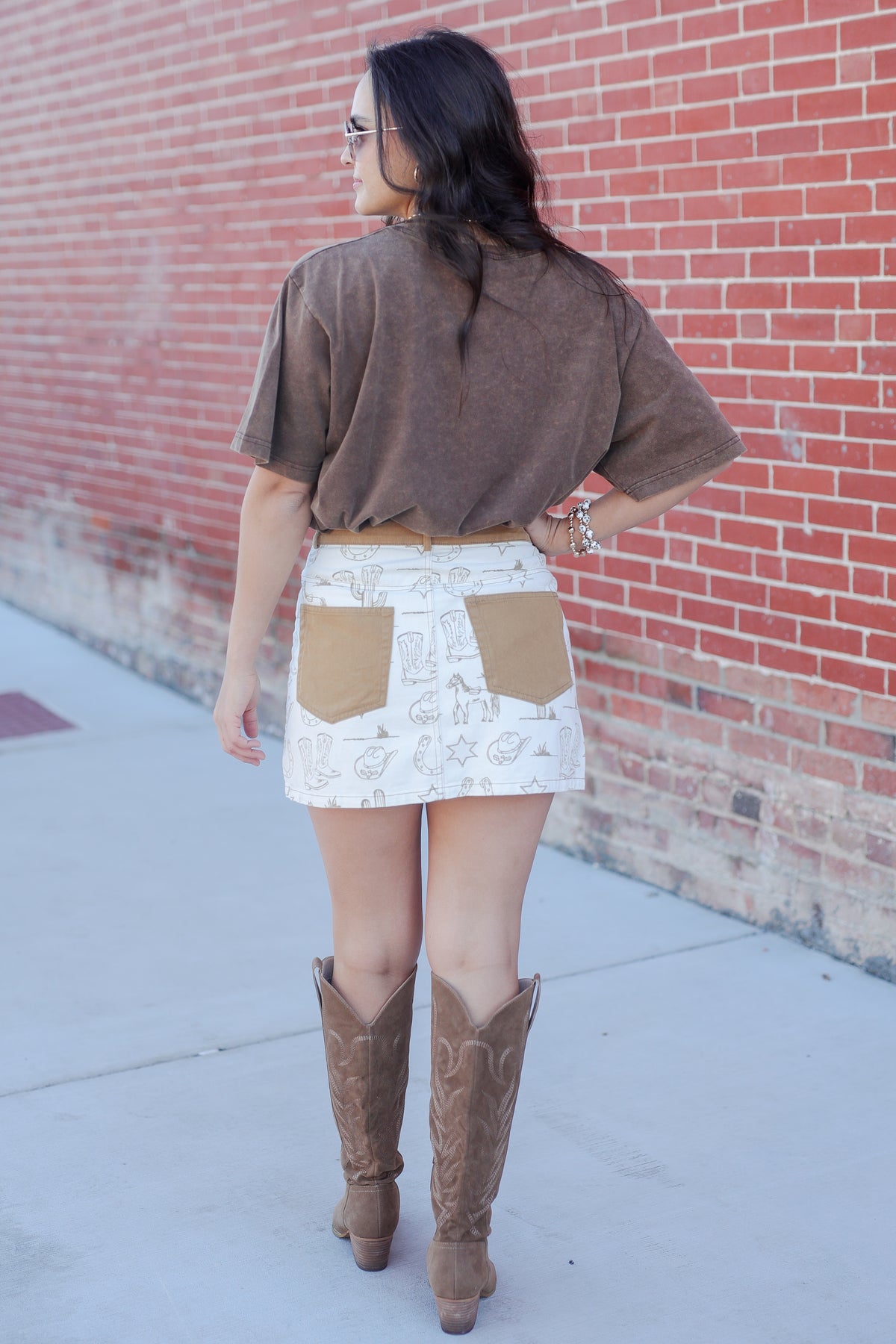 You will be living in style in this playful western skirt! Featuring an allover western print with boots, horses, and cacti, cream denim base, high-waisted fit, belt loops, and a front button and zip closure, this skirt is perfect for creating effortless looks from day to night. The durable yet soft cotton construction provides comfort and structure.