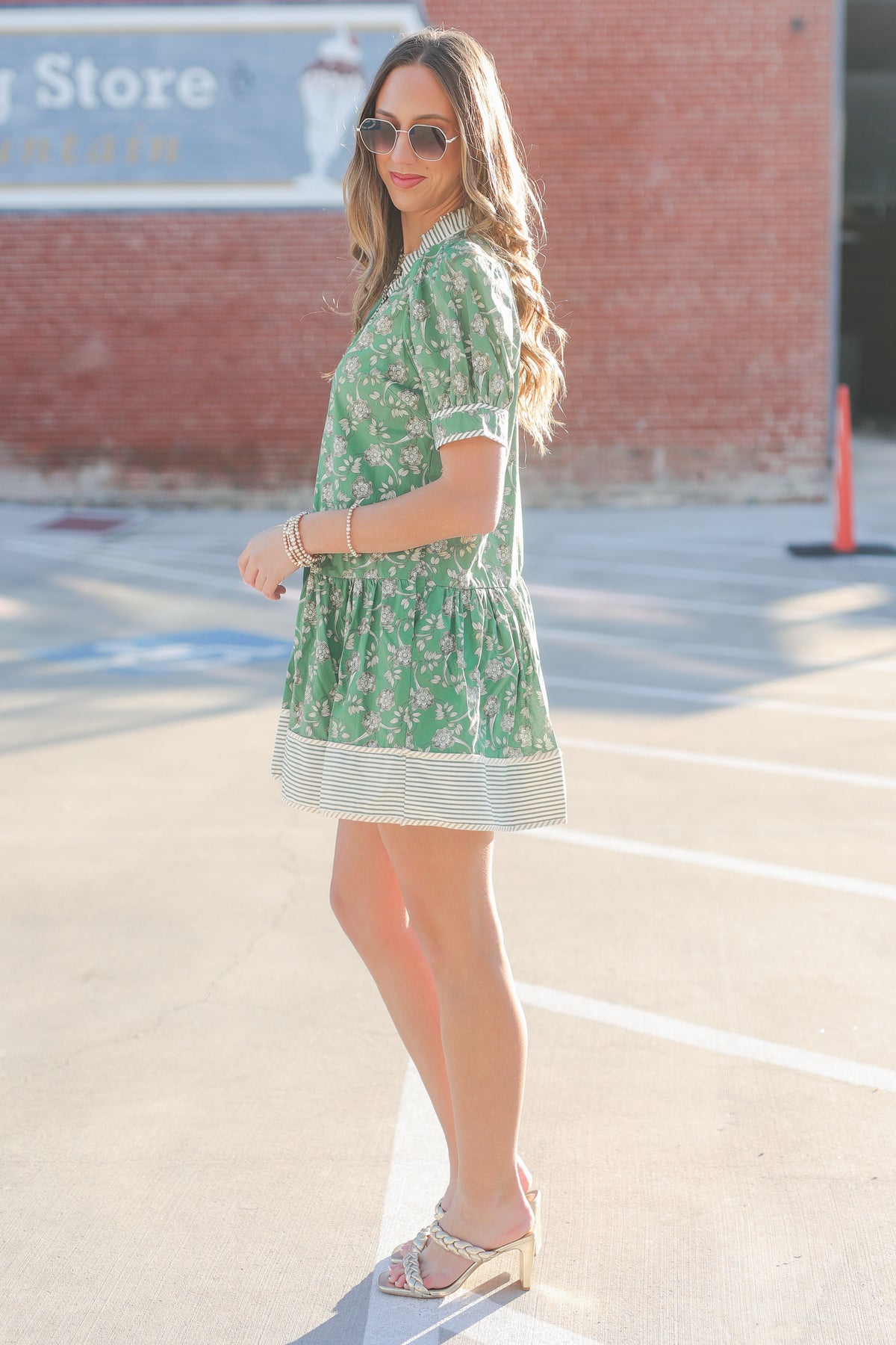 Bring effortless southern belle charm to your wardrobe with the Coastal Bloom Tiered Button-Up Dress. This women’s dress features a playful floral print, high ruffle collar, and v-neckline with a button-up front. The short puff sleeves, tiered hem, and striped trim add feminine detailing, while the fully lined construction and hidden pockets provide comfort and practicality. Perfect for coastal strolls, brunches, or garden gatherings, pair with sandals or wedges for a relaxed, chic look.