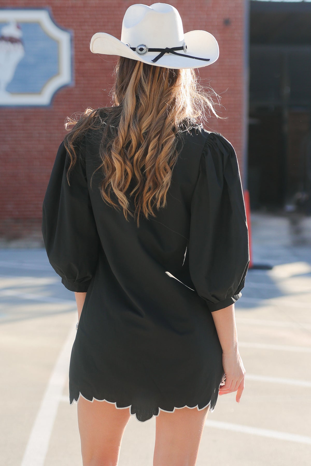 You will be turning heads in this western-inspired mini dress! Featuring contrast embroidered detailing, flowy silhouette with puffed sleeves, scalloped hem, and pockets, this dress is perfect for creating effortless looks from day to night. The polyester-cotton blend provides comfortable, breathable wear with a flattering fit.