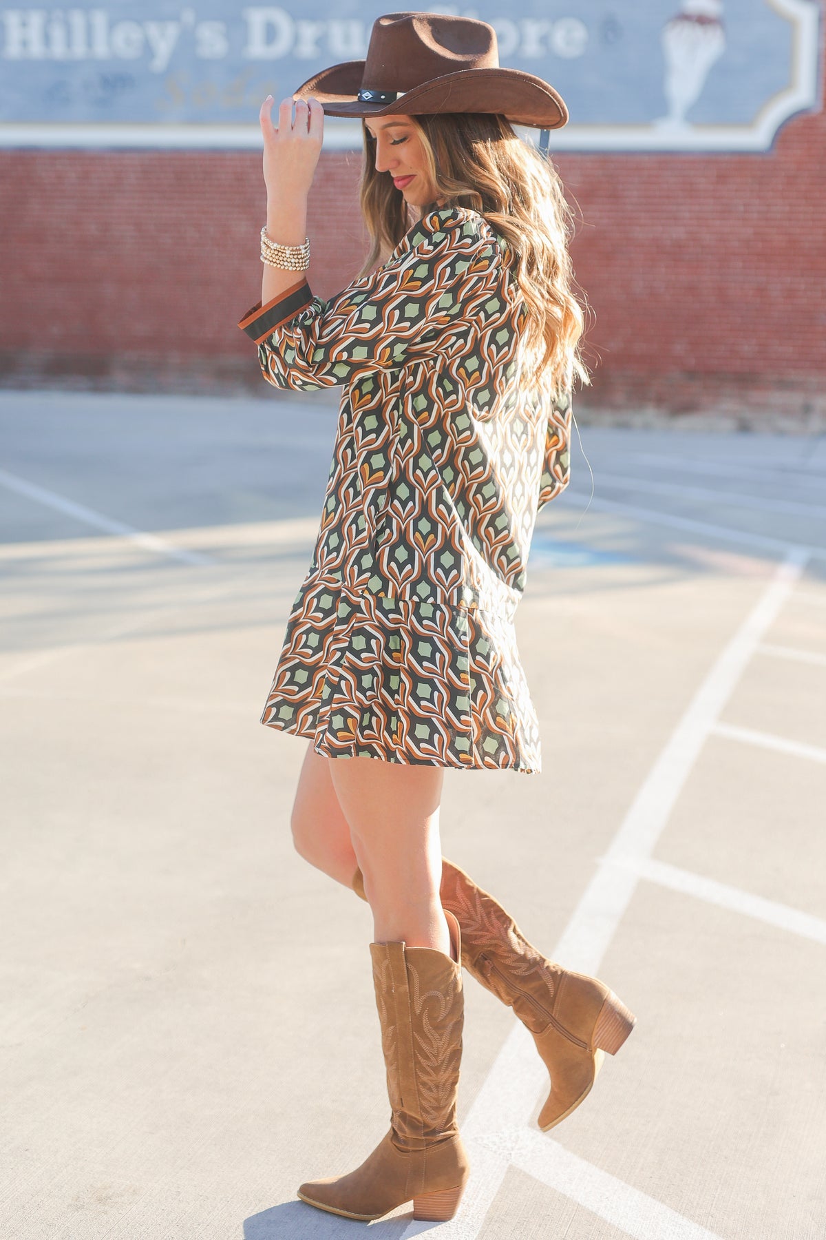 You will be turning heads in this retro-inspired swing dress! Featuring a bold Western print in rich earthy desert tones, drop-waist swing silhouette, 3/4 balloon sleeves with cuff detailing, and an easy pullover style, this dress is perfect for creating effortless looks from day to night. The lightweight cotton fabric provides comfortable, breathable wear.