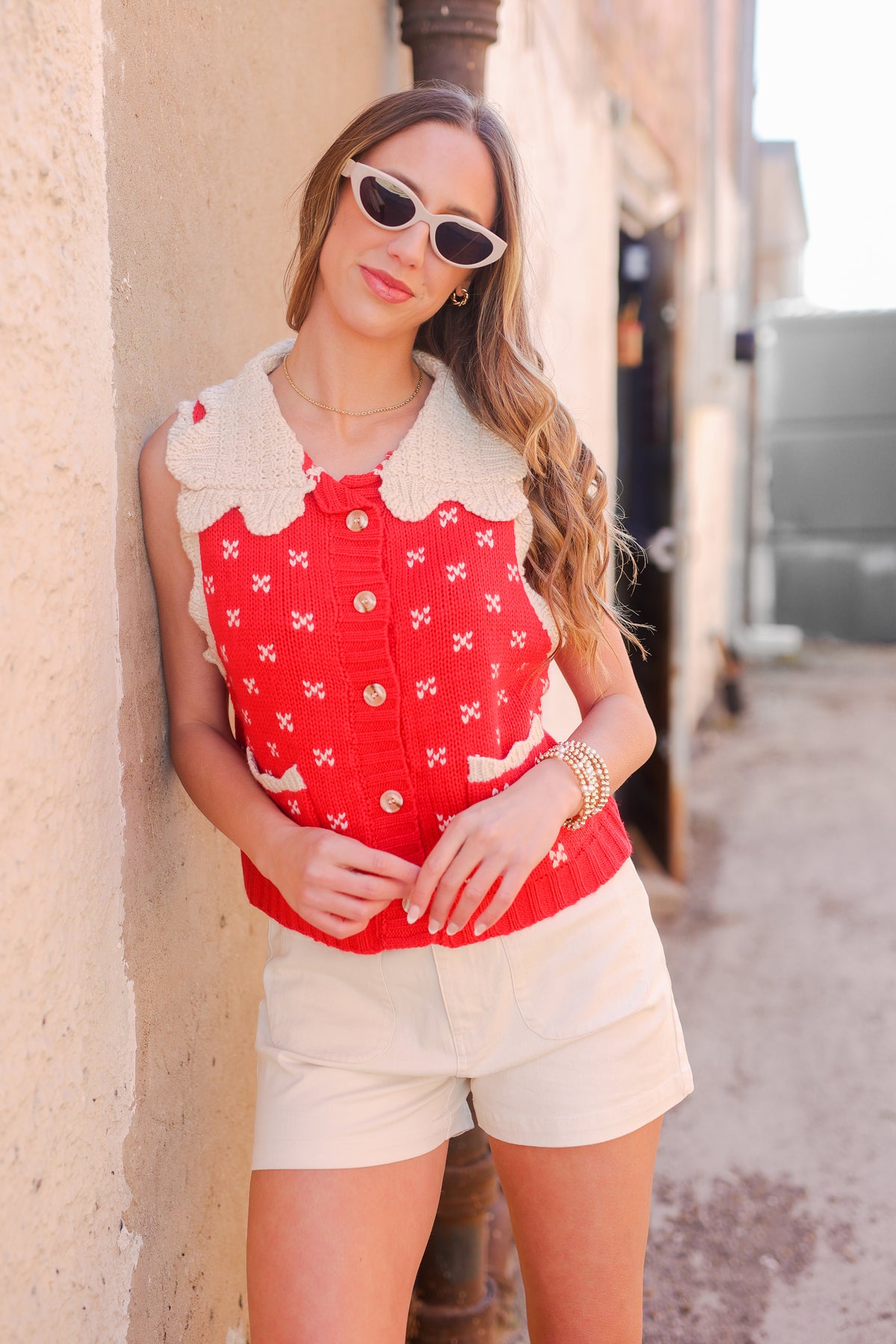 You will be looking adorable in this charming sweater vest! Featuring a bold berry-red base, darling mini bow details, playful white trim, oversized crochet scallop collar, and a button-front closure with wooden buttons, this vest is perfect for creating effortless looks from day to night. The soft, breathable knit fabric makes it ideal for layering or wearing alone.