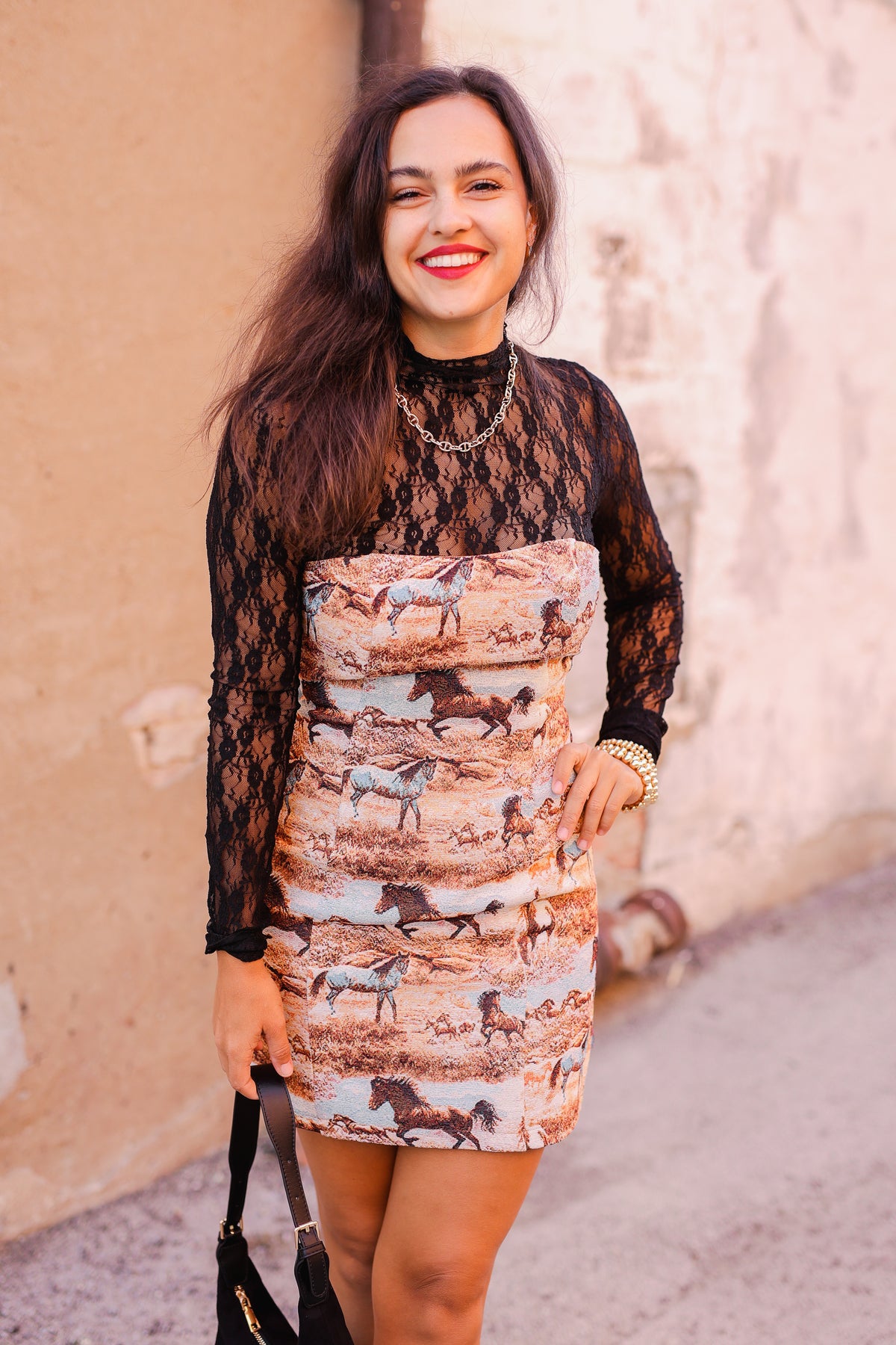 The Midnight Serenade Lace Top is the definition of sultry sophistication. This women’s black lace blouse features a mock neckline, long sleeves, and a sheer, vintage-inspired lace pattern that feels timeless yet undeniably bold. Designed with a fitted silhouette, it’s the kind of top that instantly elevates your look with just the right amount of mystery.