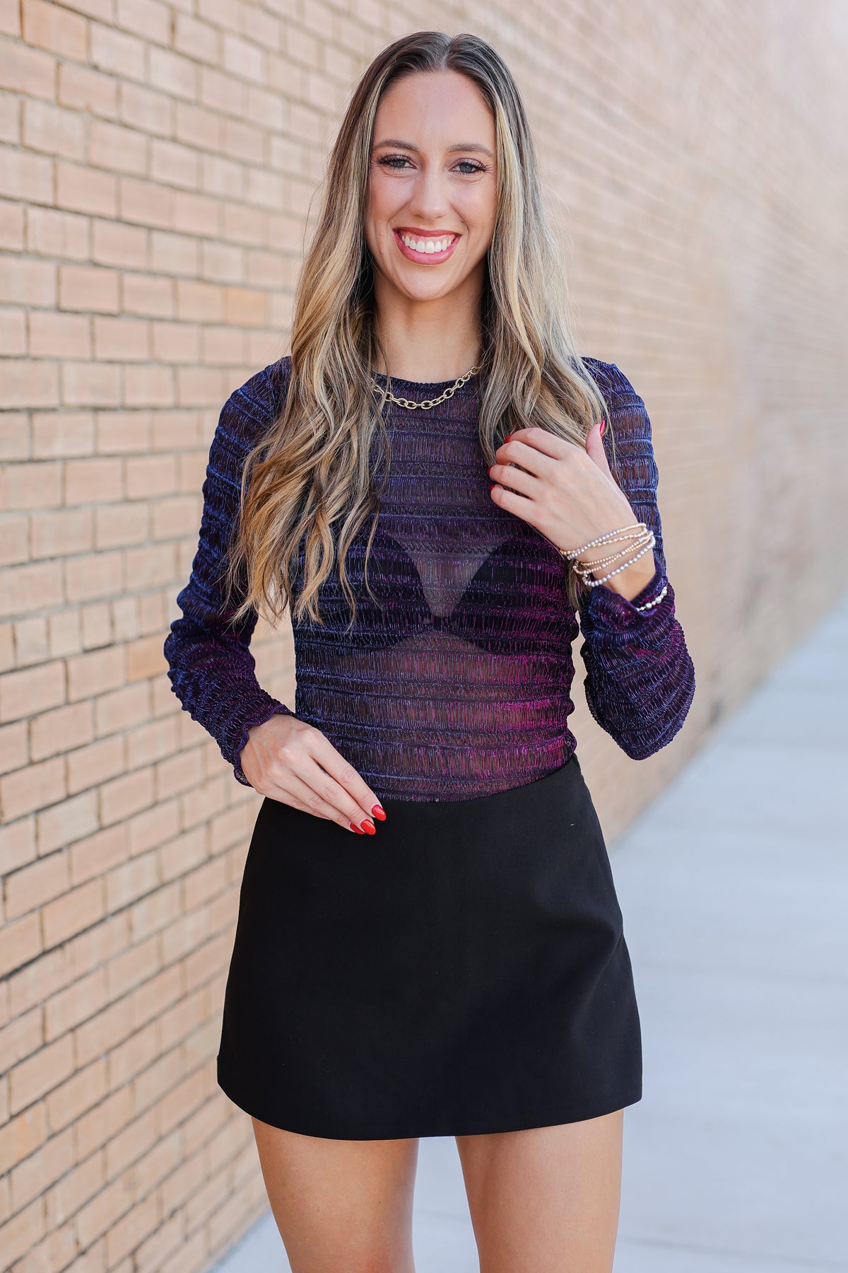 Perfect for date nights, concerts, or rooftop drinks, the Starlight Stripes Mesh Top is one of those pieces that makes getting dressed feel effortless. Wear it layered over a bralette with high-rise denim for a bold, night-out look, tuck it into a skirt and heels for something sleek and dressy, or pair it with leather pants when you’re ready to go full-on glam. Lightweight and breathable, it’s just as comfortable as it is chic.