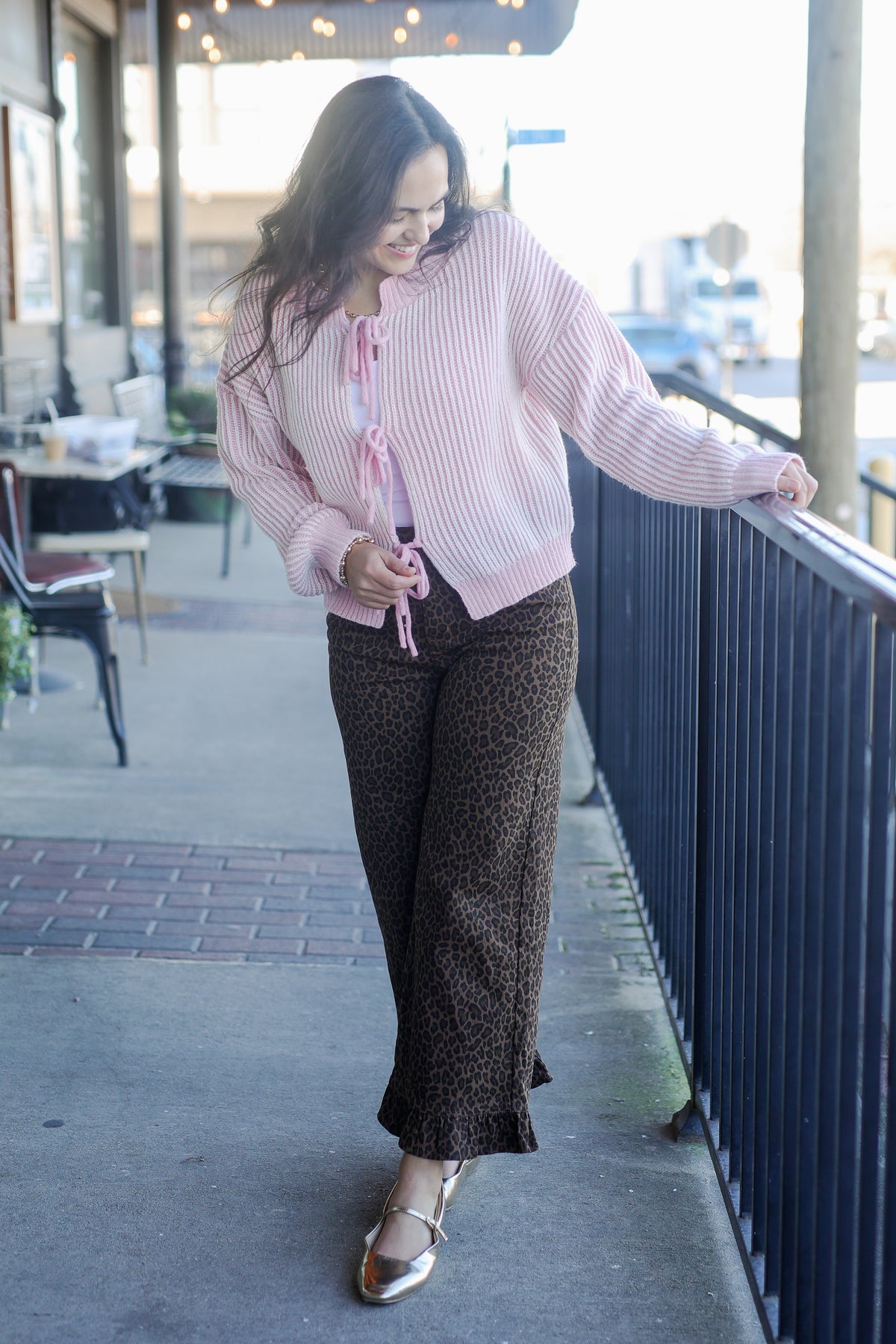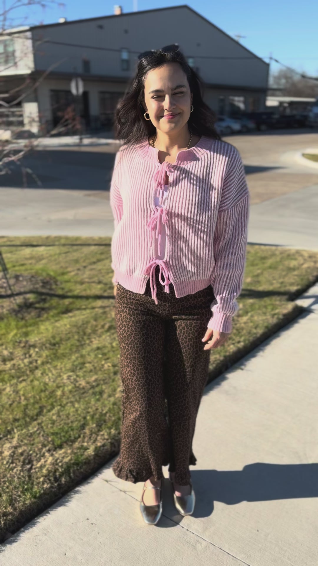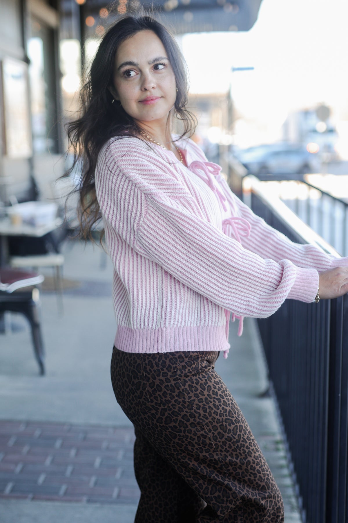 Elevate your wardrobe with this romantic tie-front cardigan! Featuring a soft ribbed knit fabric, feminine front bow tie closures, long sleeves with ribbed cuffs, and a blush pink color, this cardigan is the perfect layering piece for creating polished looks from work to weekend.