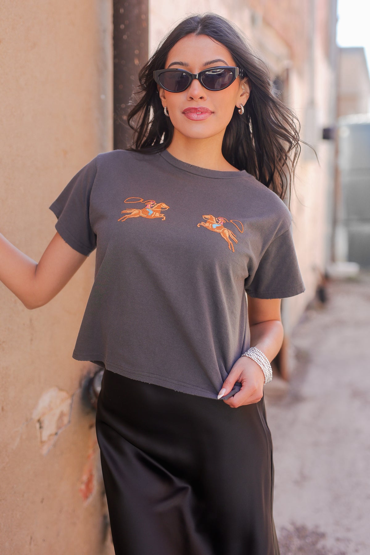 Kick up your casual style in this charcoal-washed cropped tee! Featuring two embroidered cowgirl-on-horse designs across the chest, soft broken-in cotton feel, boxy fit, and a charcoal-washed finish, this tee is perfect for creating effortless looks from day to night. The bold western detail gives it that perfect touch of rodeo energy.