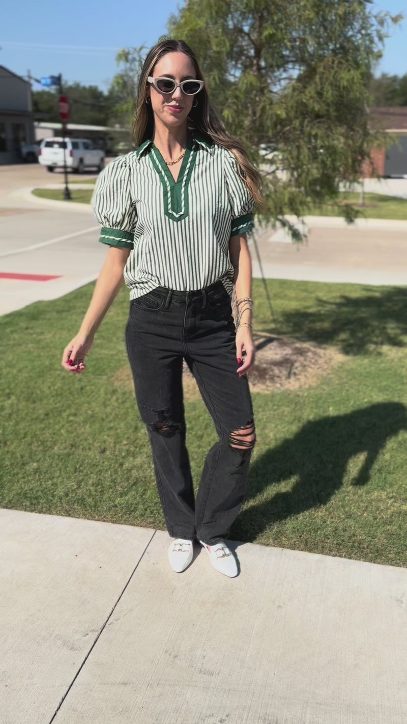 The Boardwalk Stroll Blouse is an instant classic with a playful twist. Designed in crisp hunter green and cream stripes, this women’s collared blouse features a flattering notch V-neckline with bold contrast trim, short puff sleeves, and a relaxed fit that drapes effortlessly. The blend of cotton and polyester keeps it breathable and easy to wear, whether you’re headed to the office, brunch, or a weekend adventure.