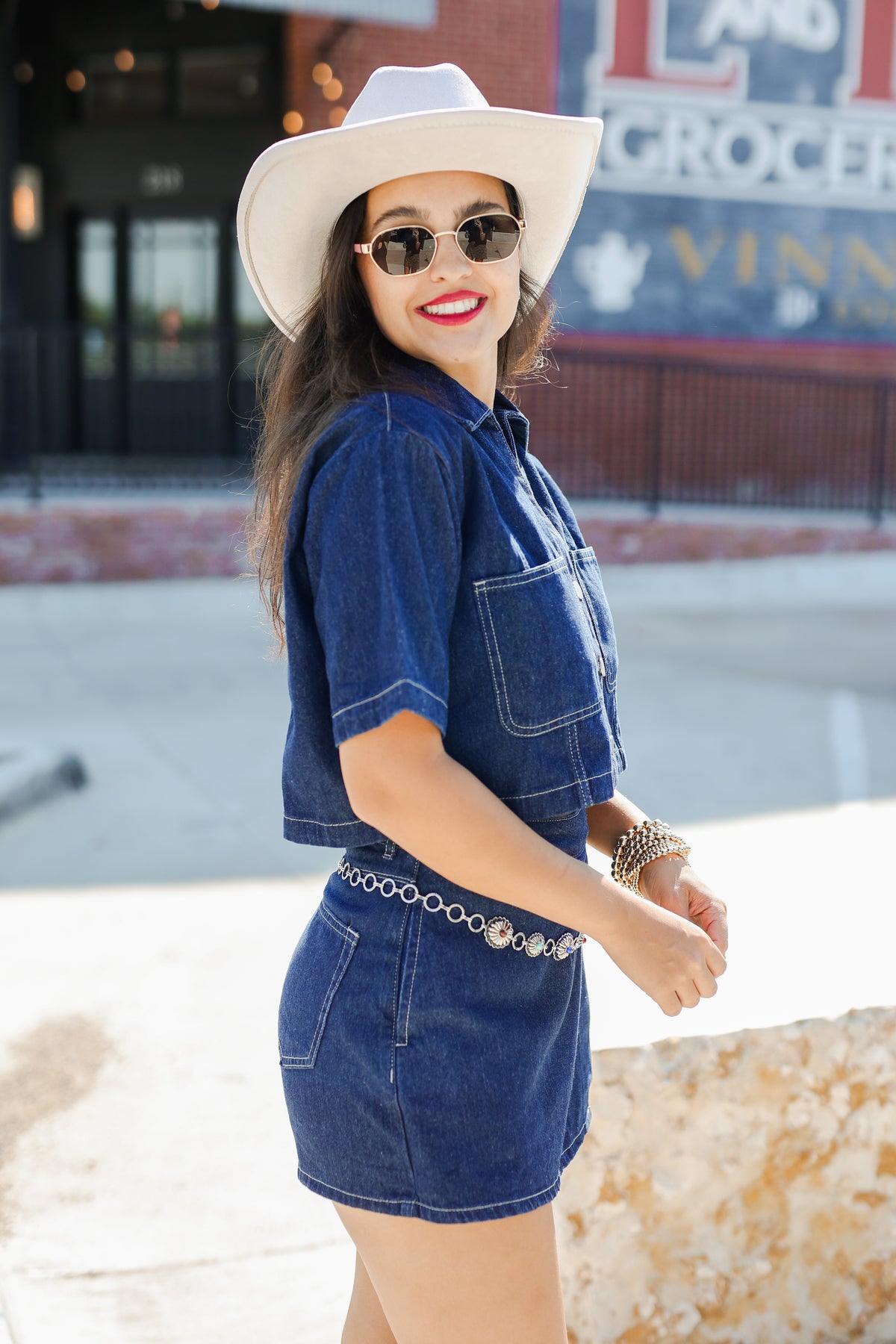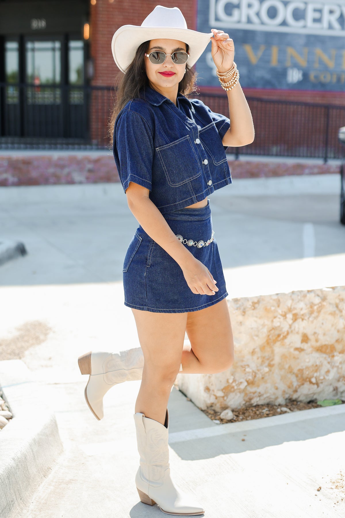 Perfect for warm-weather days or layering under jackets, this dark wash chambray crop top adds a little edge to your everyday outfits. The short sleeves keep it breezy, while the button-up front makes it easy to style open or closed. Pair it with high-rise denim for a bold denim-on-denim look, or tuck it into skirts and shorts for a flirty, laid-back vibe.