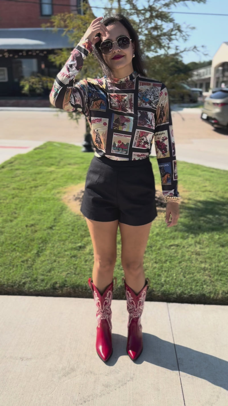 The Most Wanted Poster Mesh Top is made for western girls who love to stand out. Crafted in a lightweight mesh fabric with stretch, this long sleeve women’s top features a collage-style print of vintage-inspired rodeo posters, desert scenes, and bold cowboy graphics. With a fitted silhouette and just the right amount of stretch, it’s the perfect piece for layering or wearing solo when you want to make a statement.