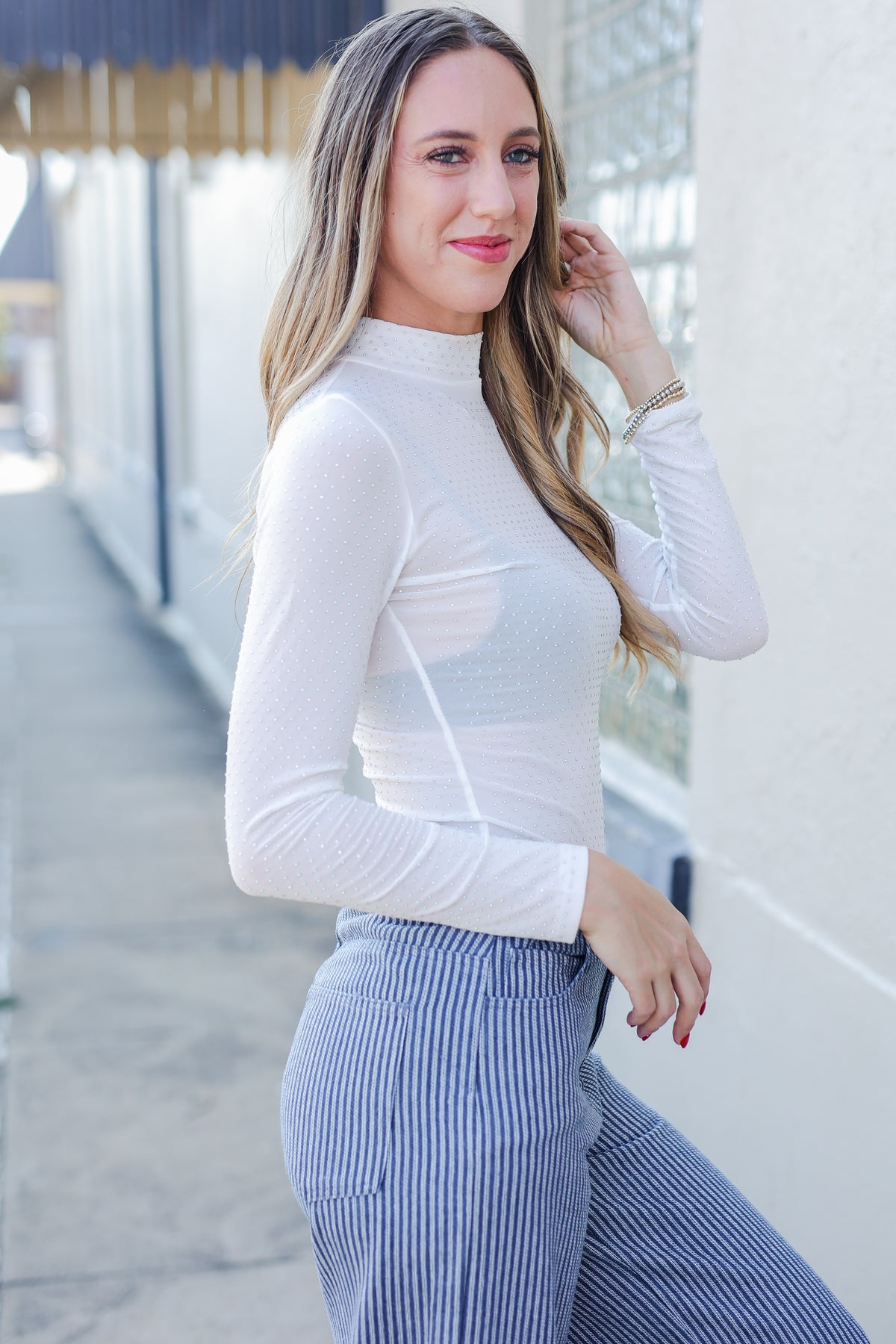 Dazzle with confidence in the Starlight Mesh Rhinestone Bodysuit, a show-stopping women’s bodysuit designed for nights that demand sparkle. Crafted from sheer mesh fabric with rhinestones shimmering across a white base, this chic piece features a sleek mock neckline and long sleeves for a polished yet daring look. Wear it layered under a blazer for a night out or style it solo with high-rise jeans or a mini skirt for a seamless, head-turning outfit.