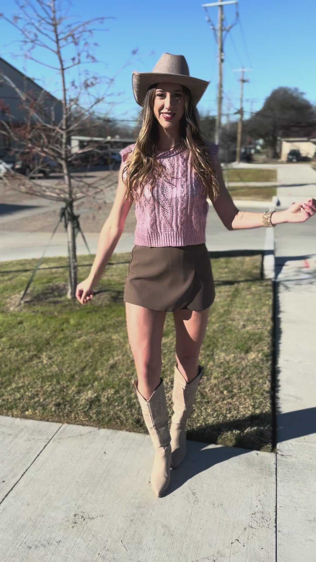 You will be shining bright in this stunning knit tank! Featuring sequin-kissed cable knit, sleeveless silhouette, chunky ribbed trim, and a dusty rosé hue, this tank is perfect for creating effortless looks from day to night. The soft stretch fabric with subtle structure makes it ideal for layering or wearing solo.