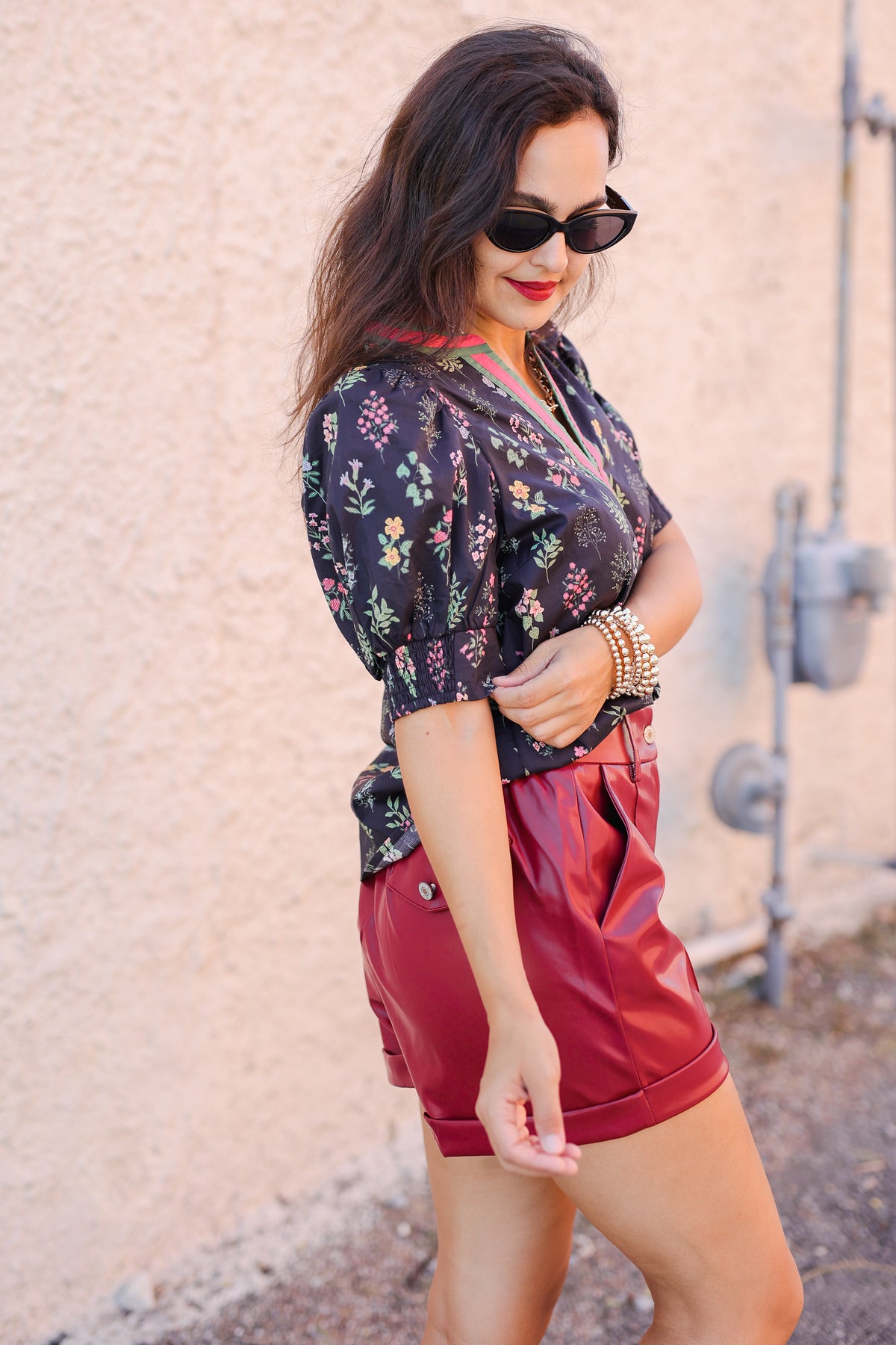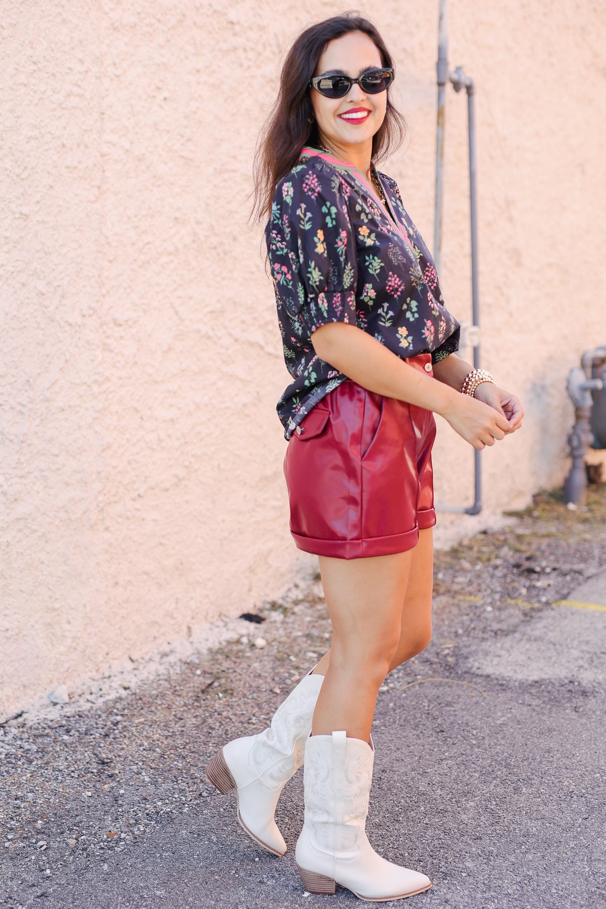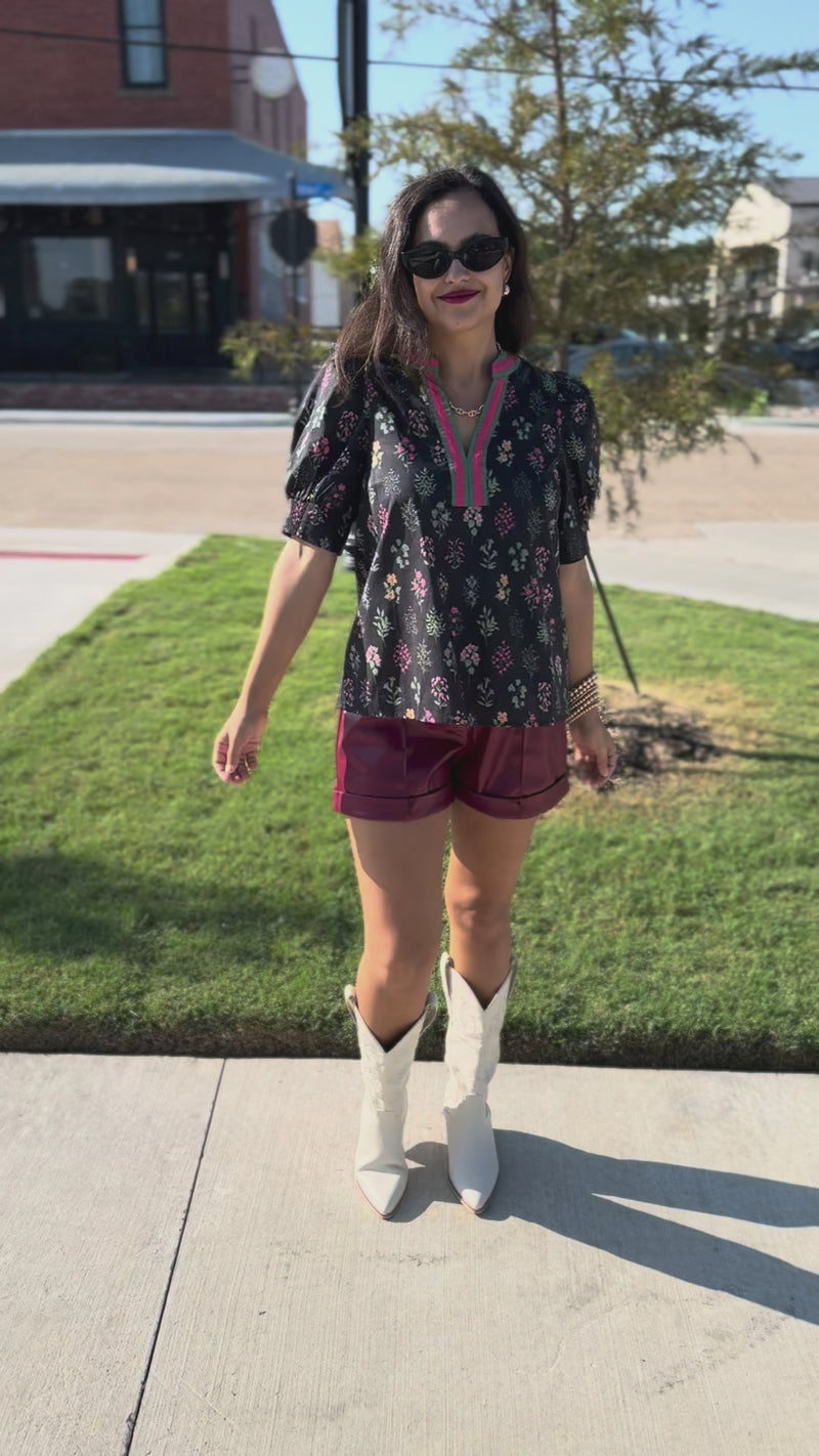 The Wild Bouquet Blouse is made for those days when you want your outfit to feel as fun as your mood. With its notch V-neckline trimmed in pink ribbon, banded short sleeves, and easy relaxed fit, it’s one of those tops that just feels good the moment you put it on. The playful mix of bright pink and green florals gives it that fresh-picked energy that instantly livens up your look.