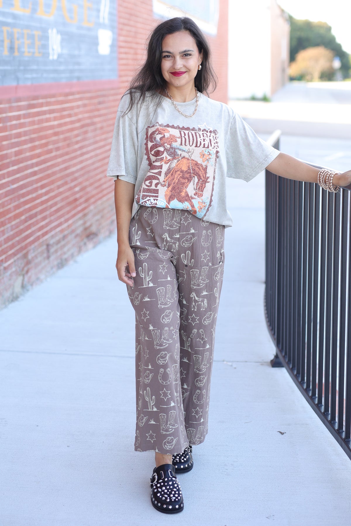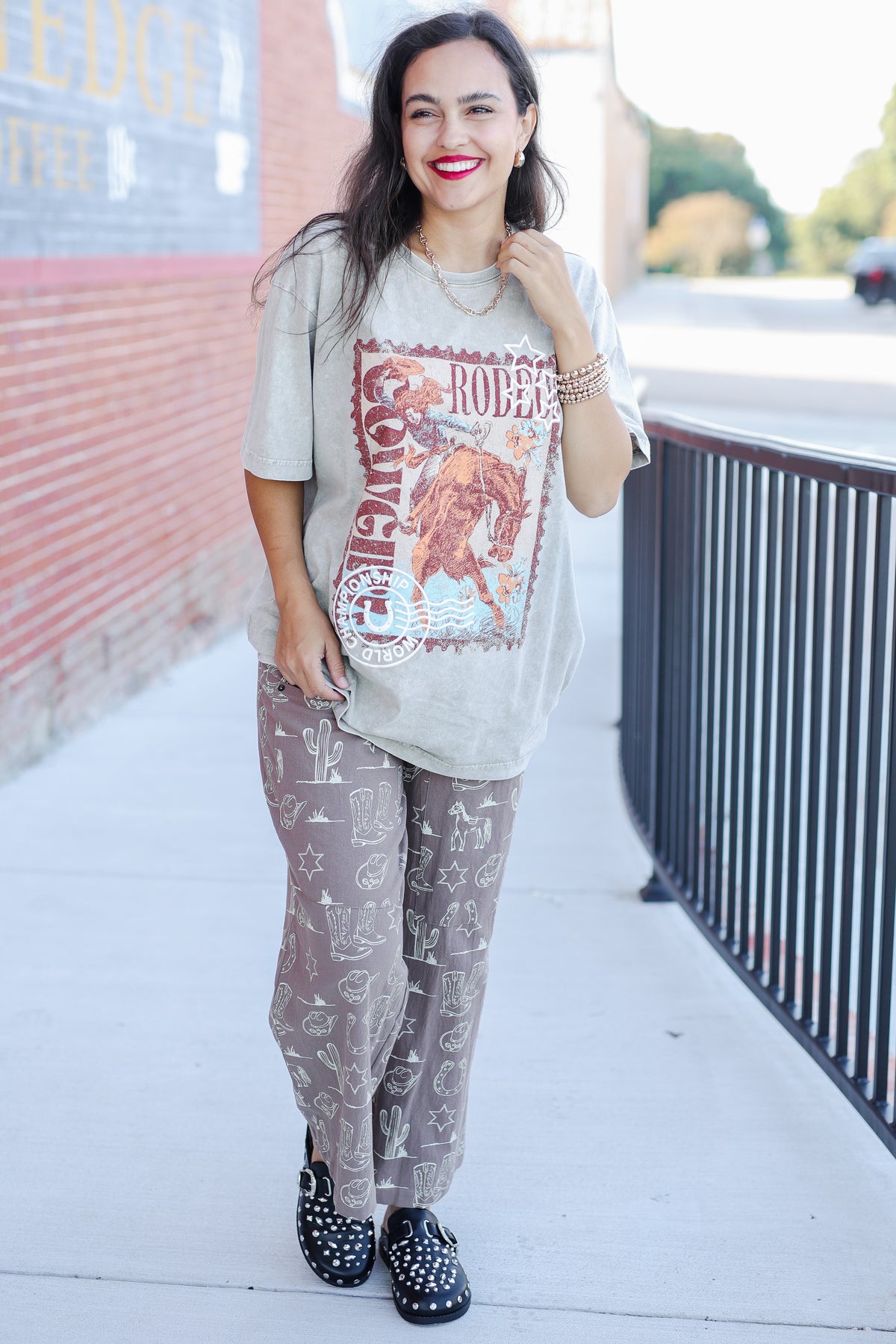 The Rodeo Cowgirl Postage Tee delivers vintage western charm with a bold, modern twist. This women’s rodeo graphic tee is made from 100% cotton in a mocha-toned mineral wash for that perfectly worn-in feel. Designed with a crew neckline, short sleeves, and a relaxed fit, it’s finished with a statement postage-style print featuring a bronc rider, floral accents, and western stars—making it a true standout piece.