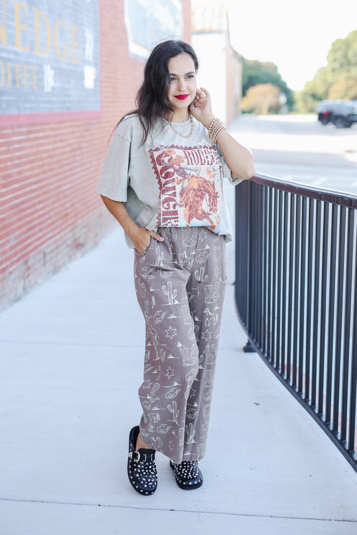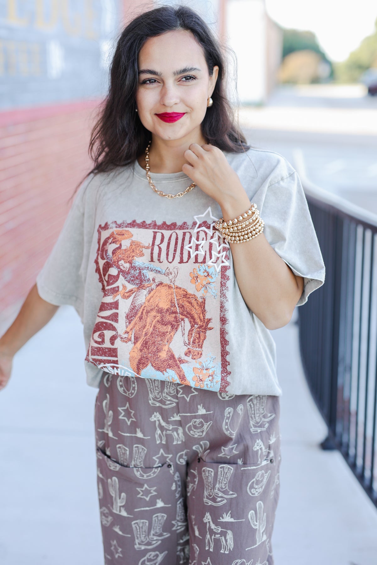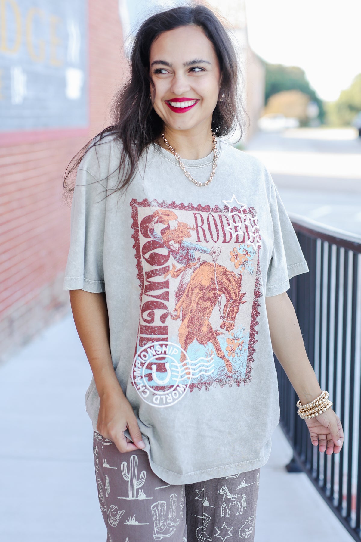 Perfect for weekend rodeos, outdoor concerts, or road trip adventures, the Rodeo Cowgirl Postage Tee is easy to style in endless ways. Pair it with cutoffs and boots for a true cowgirl vibe, tuck it into wide-leg denim for an effortless everyday look, or knot it over a skirt when you’re craving something flirty and fun. However you wear it, this tee keeps western style front and center.