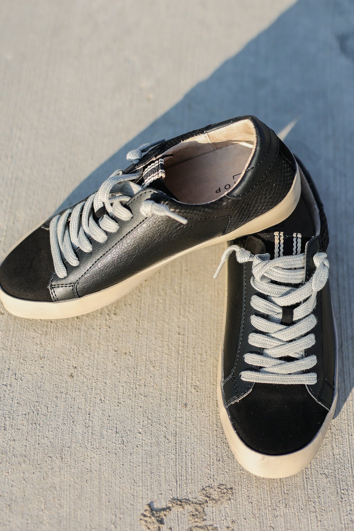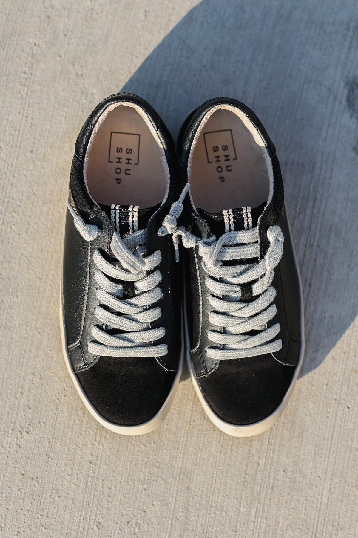 Meet your new everyday essential—the Rebel Sneaker - Black - bring effortless style and modern versatility to your casual wardrobe. Crafted with sleek black panels of smooth leather, textured suede, and pebbled accents, these sneakers feature a sporty lace-up design with contrast ivory soles and striped pull-tab detailing at the tongue.