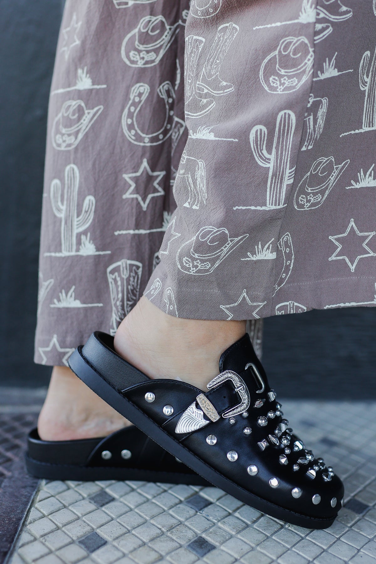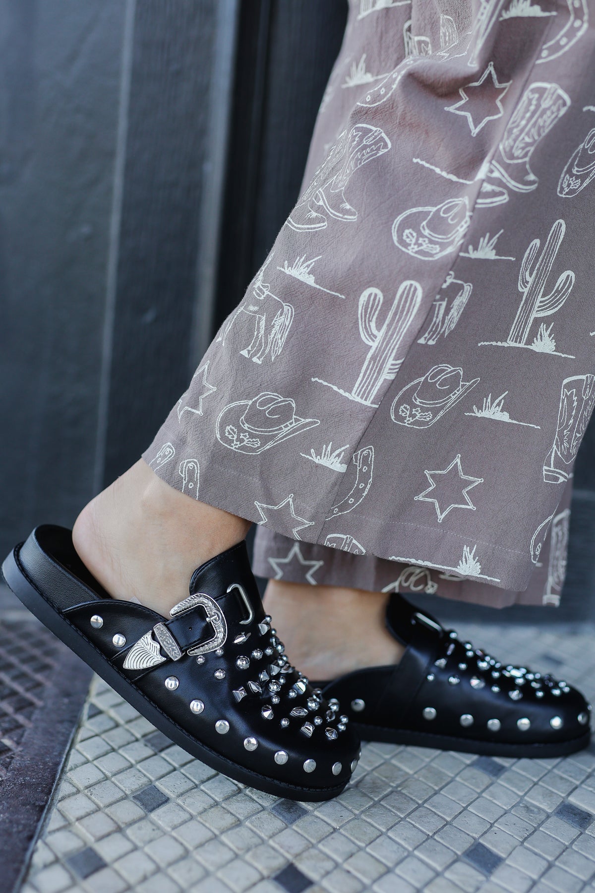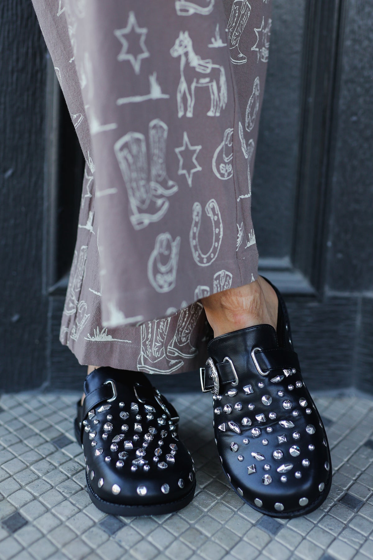 Step into edgy elegance with the Turin – Black, a bold and fashion-forward clog designed for the trendsetter who’s not afraid to shine. These studded slip-on shoes command attention with their intricate silver hardware, western-inspired buckles, and an array of dazzling studs in mixed shapes and sizes.