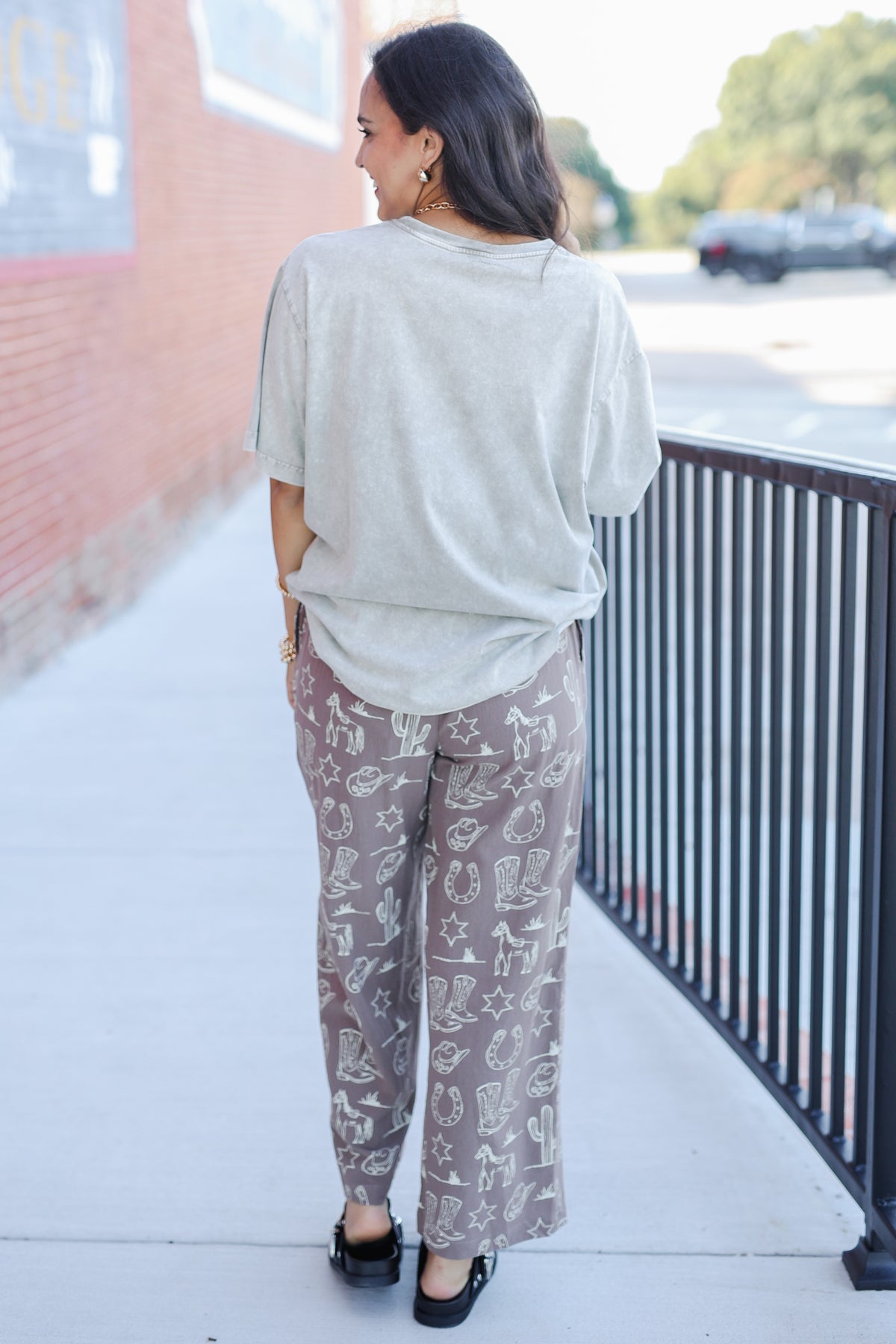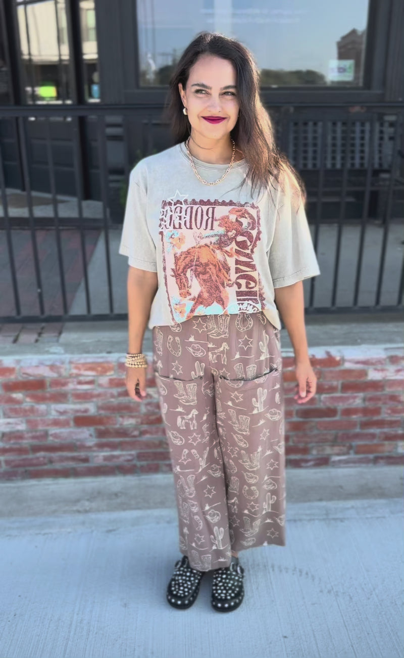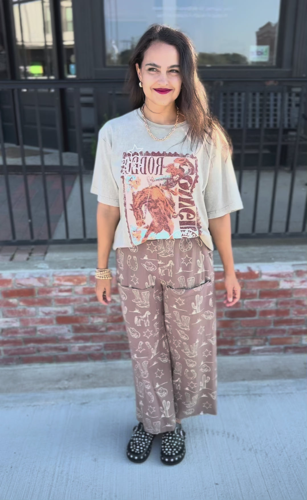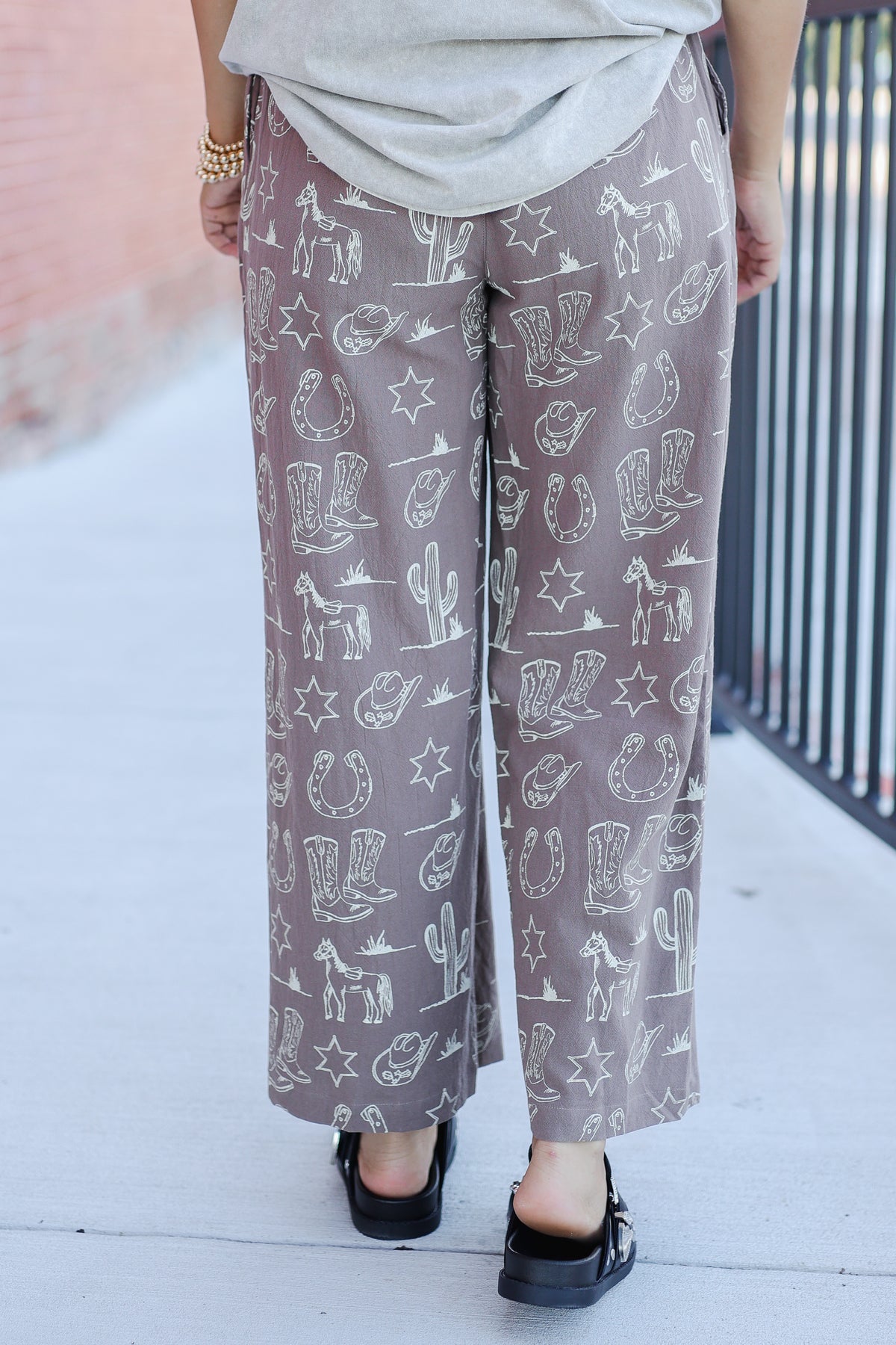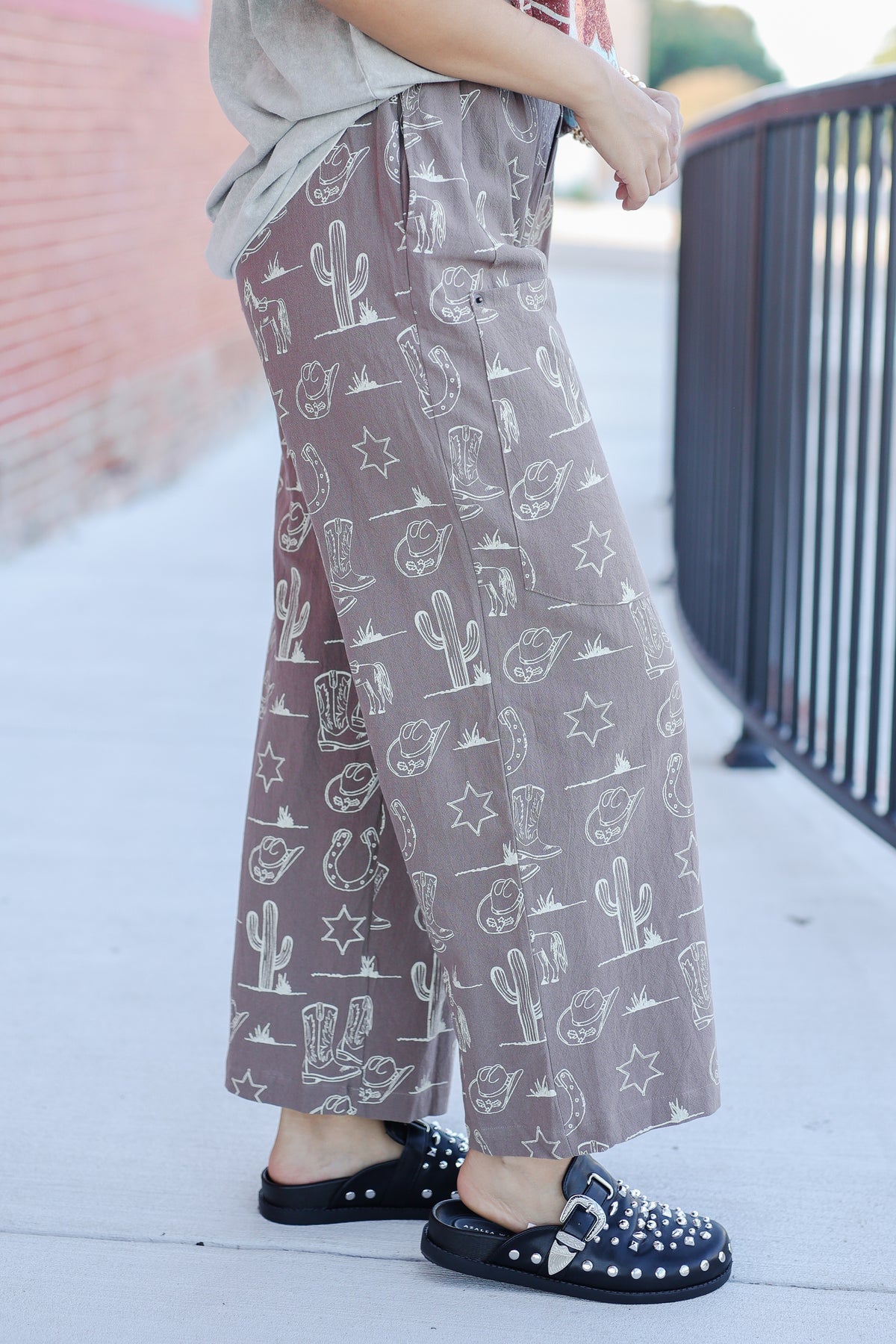 The Desert Trail Printed Pants bring playful western charm to your everyday look. Crafted from lightweight 100% cotton, these women’s wide leg pants feature a coco-colored base with all-over western-inspired motifs—think cowboy boots, cacti, horses, and stars—that make them a true standout. Designed for comfort with a relaxed leg and pull-on waistband, they’re the perfect mix of casual ease and statement style.