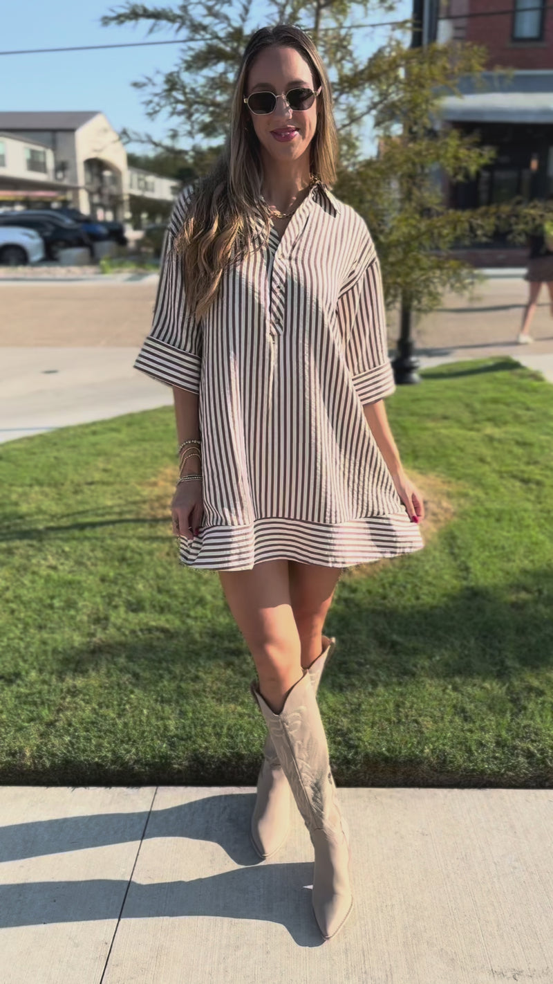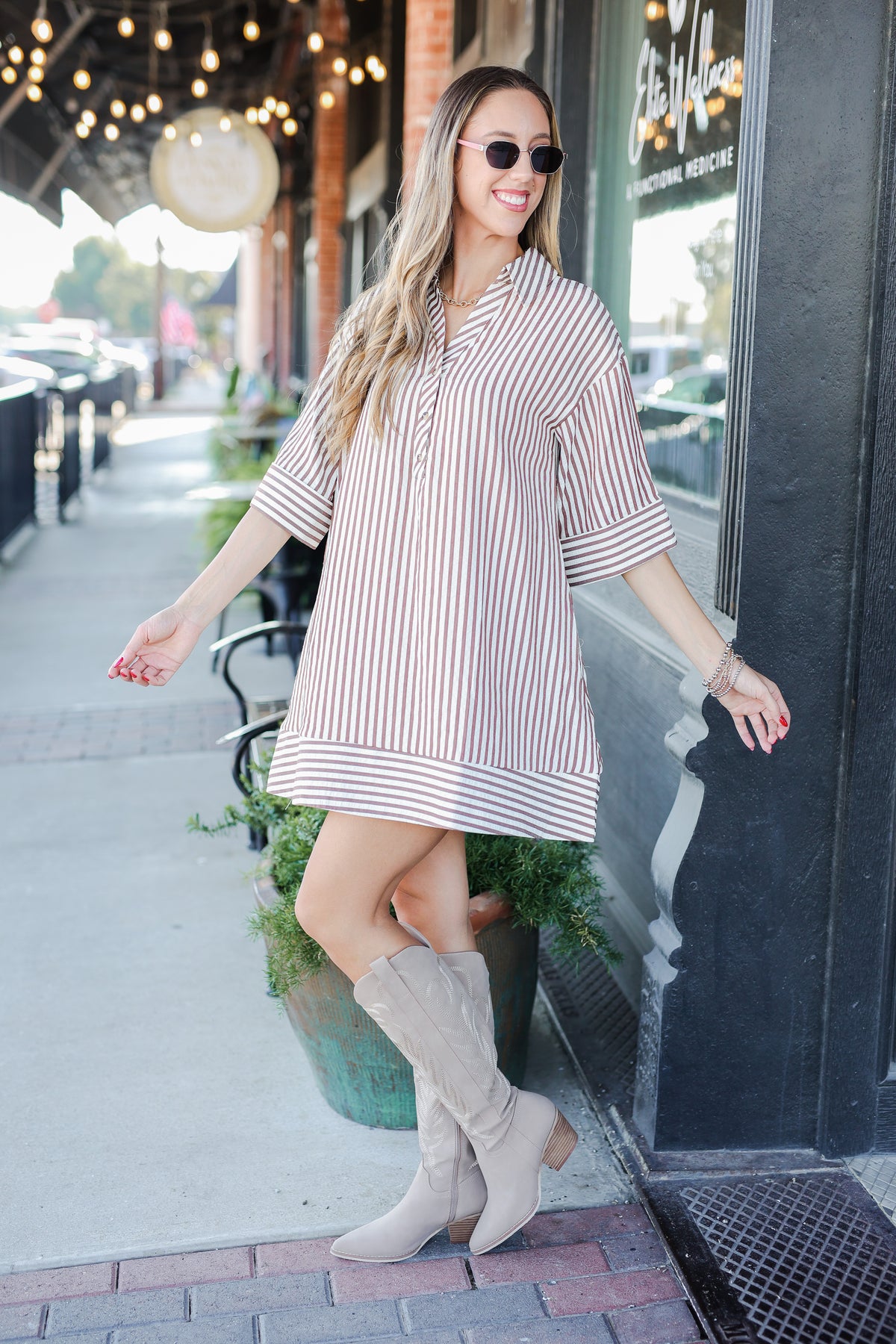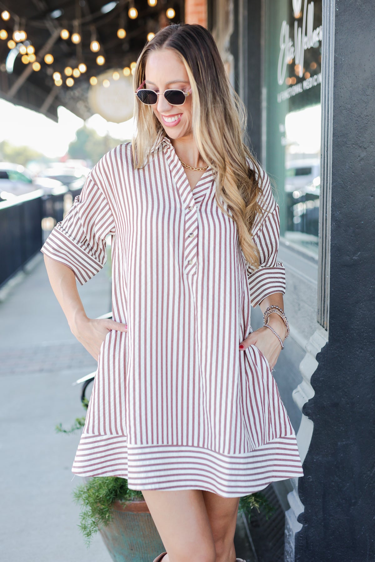 The Sweet Magnolia Striped Shift Dress is effortless charm in one simple silhouette. This women’s striped mini dress features a collared V-neckline, short cuffed sleeves, and a relaxed shift shape that’s both flattering and easy to wear. Designed in classic brown and cream stripes, it’s timeless yet playful, perfect for warm days and layered looks alike.
