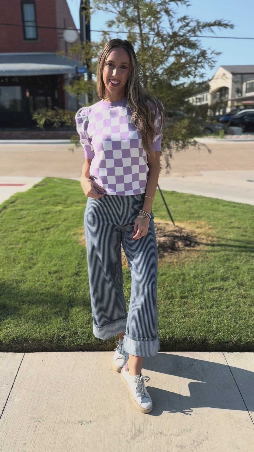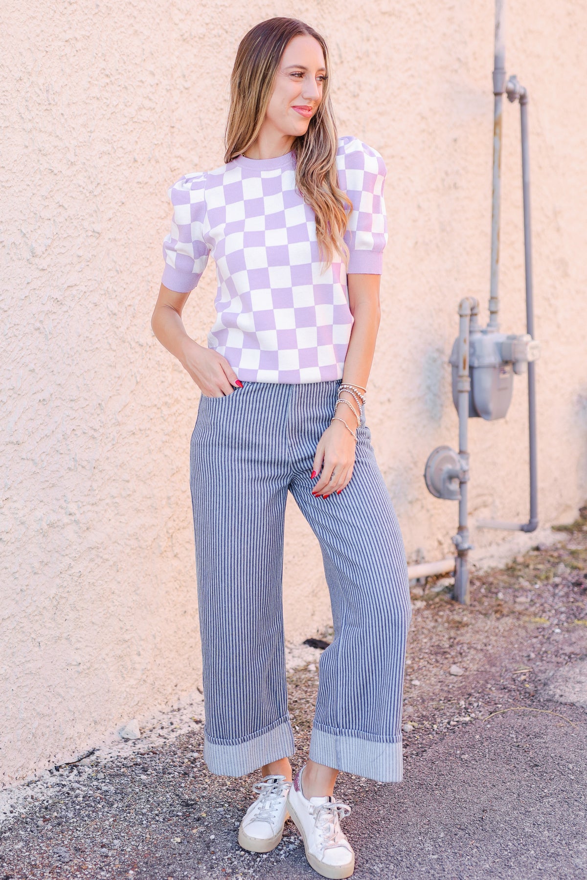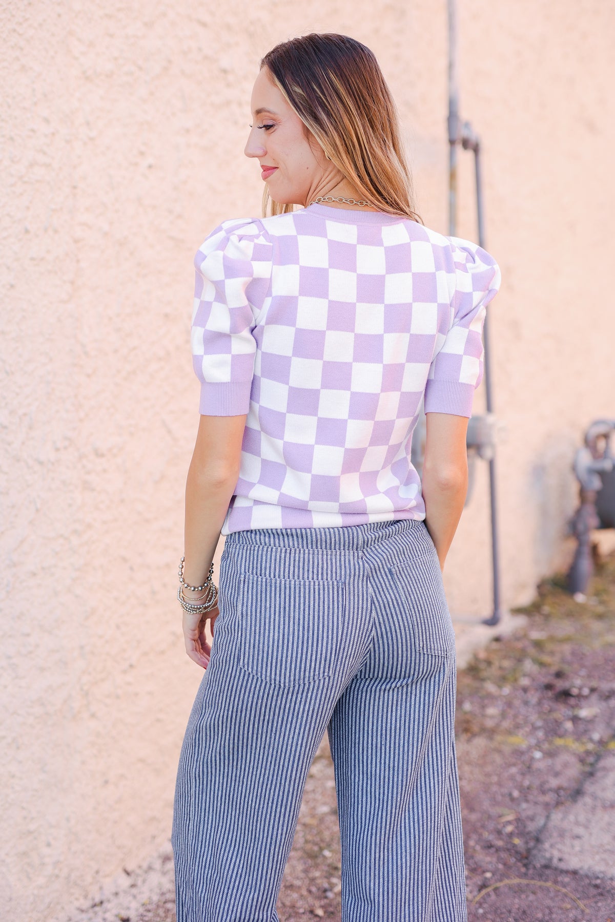 The Sweet Victory Checkered Top takes playful stripes to the next level with a bold lavender-and-cream checkerboard design. This women’s puff sleeve knit top is crafted in a luxe viscose blend that’s lightweight yet polished, making it the perfect mix of casual charm and elevated style. The puffed short sleeves and fitted hemline give it a sweetly feminine silhouette that still feels modern and fun.